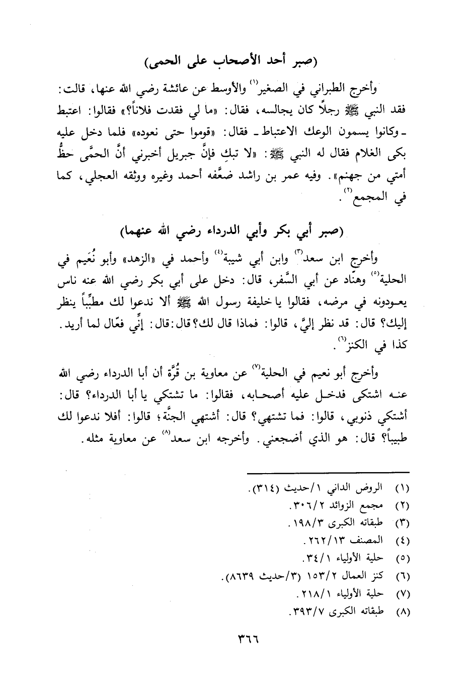 وأخرج ابن سعد وابن أبي شيبة وأحمد في الزهد وأبو نُعَيم في الحلية وهنّاد عن أبي السَّفر قال: دخل على أبي بكر رضي الله عنه ناس يعودونه في مرضه، فقالوا يا خليفة رسول الله صلى الله عليه وسلم ألا ندعو لك مطيِّباً ينظر إليك؟ قال: قد نظر إليَّ، قالوا: فماذا قال لك؟ قال قال: إنِّي فعّال لما أريد. كذا في الكنزل، وأخرج أبو نعيم في الحلية عن معاوية بن قُرَّة أن أبا الدرداء رضي الله عنه اشتكى فدخل عليه أصحابه فقالوا: ما تشتكي يا أبا الدرداء؟ قال: أشتكي ذنوبي، قالوا: فما تشتهي؟ قال: أشتهي الجنَّة؛ قالوا: أفلا ندعو لك طبيباً؟ قال: هو الذي أضعجني. وأخجره ابن سعد عن معاوية مثله.