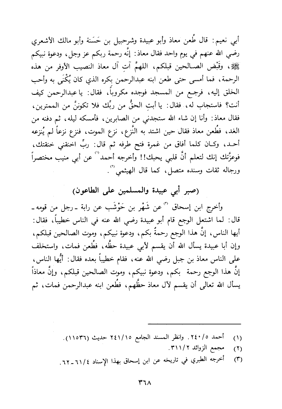 وأخرجه ابن إسحاق عن شَهْر بن حَوْشَب عن رابة - رجل من قومه - قال: لما اشتعل الوجع قام أبو عبيدة رضي الله عنه في الناس خطيباً فقال: أيها الناس، إنَّ هذا الوجع رحمةٌ بكم، ودعوة نبيكم، وموت الصالحين قبلكم، وإن أبا عبيدة يسأل الله أن يقسم لأبي عبيدة حظَّه.p فطُعن فمات، واستخلف على الناس معاذ بن جبل رضي الله عنه، فقام خطيباً بعده فقال: أيّها الناس، وإنَّ هذا الوجع رحمة بكم، ودعوة نبيكم، وموت الصالحين قبلكم، وإنَّ معاذاً يسأل الله تعالى أن يقسم لآل معاذ حظَّهم، فطُعن ابنه عبد الرحمن فمات، ثم