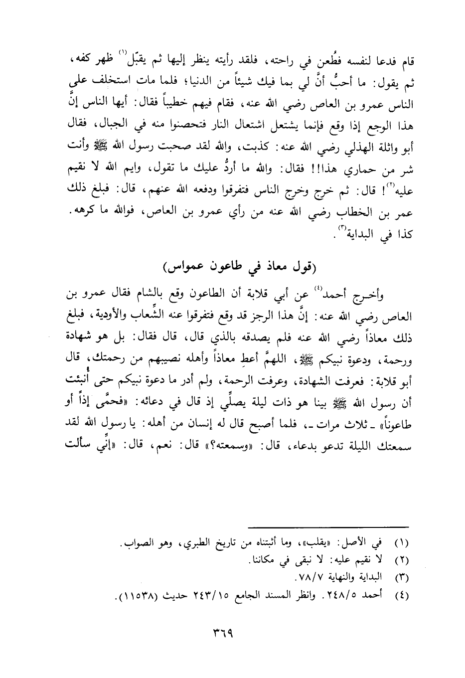 وأخرج أحمد عن أبي قلابة أنا لطاعون وقع بالشام فقال عمرو بنالعاص رضي الله عنه: إنَّ هذا الرجز قد وقع فتفرقوا عنه في الشِّعاب والأودية، فبلغ ذلك معاذاً رضي الله عنه فلم يصدقه بالذي قال، قال فقال: بل هو شهادة ورحمة، ودعوة نبيكم صلى الله عليه وسلم اللهمَّ إعطِ معاذاً وأهله نصيبهم من رحمتك، قال أبو قلابة: فعرفت الشهادة، وعرفت الرحمة، ولم أدر ما دعوة نبيكم حتى أُنبئت أن رسول الله صلى الله عليه وسلم بينا هو ذات ليلة يصلِّي إذ قال في دعائه: «فحمَّى إذاً أو طاعوناً» - ثلاث مرات -، فلما أصبح قال له إنسان من أهله: يا رسول الله لقد سمعتك الليلة تدعو بدعاء، قال: «وسمعته» ؟ قال: نعم، قال: «إنِّي سألت
