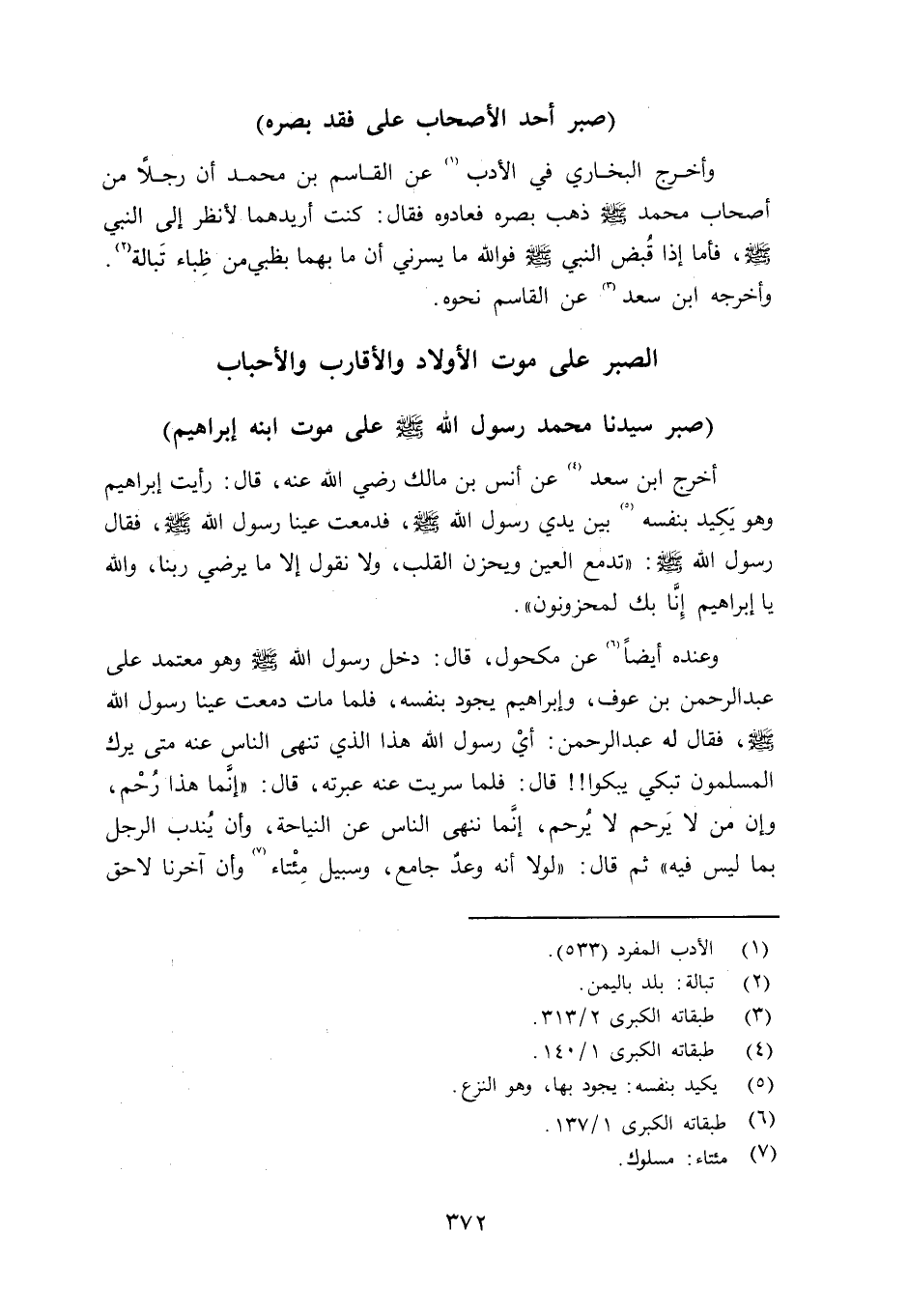 وأخرج البخاري في الأدب (ص78) عن القاسم بن محمد أن رجلاً من أصحاب محمد صلى الله عليه وسلم ذهب بصره فعادوه فقال: كنت أريدهما لأنظر إلى النبي صلى الله عليه وسلم فأما إذا قُبض النبي صلى الله عليه وسلم فوالله ما يسرني أن ما بهما بظبي من ظِباء تَبالة. وأخرجه ابن سعد عن القاسم نحوه.