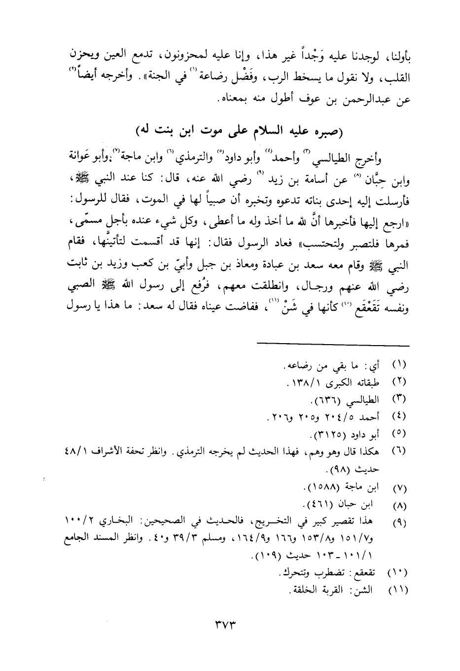 وأخرجه الطيالسي وأحمد وأبو داود والترمذي وابن ماجه وأبو عَوانة وابن حِبَّان عن أسامة بن زيد رضي الله عنه قال: كان عند النبي صلى الله عليه وسلم فأرسلت إليه إحدى بناته تدعوه وتخبره أن صبياً لها في الموت، فقال للرسول: «ارجع إليها فأخبرها أنَّ الله ما أخذ وله ما أعطى، وكل شيء عنده بأجل مسمّى، فمرها فلتصبر ولتحتسب» فعاد الرسول فاقل: إنها قد أقسمت لتأتينَّها، فقام النبي صلى الله عليه وسلم وقام معه سد بن عبادة ومعاذ بن جبل وأبي بن كعب وزيد بن ثابت رضي الله عنهم ورجال، وانطلقت معهم، فرُفع إلى رسول الله صلى الله عليه وسلم الصبي ونفسه تَقَعْقَع كأنها في شَنْ، ففاضت عيناه فقال له سعد: ما هذا يا رسول