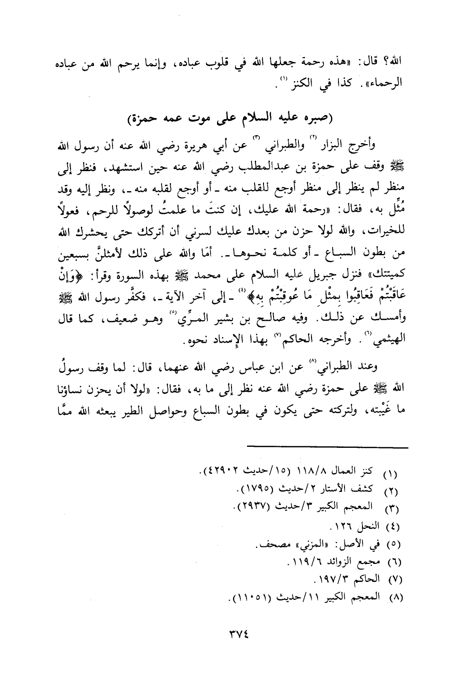 وعند الطبراني عن ابنع باس رضي الله عنهما قال: لما وقف رسول الله صلى الله عليه وسلم على حمزة رضي الله عنه نظر إلى ما به فقال: «لولا أن يحزن نساؤنا ما غيبته، ولتركته حتى يكون في بطون السباع وحواصل الطير يبعثه الله ممَّا