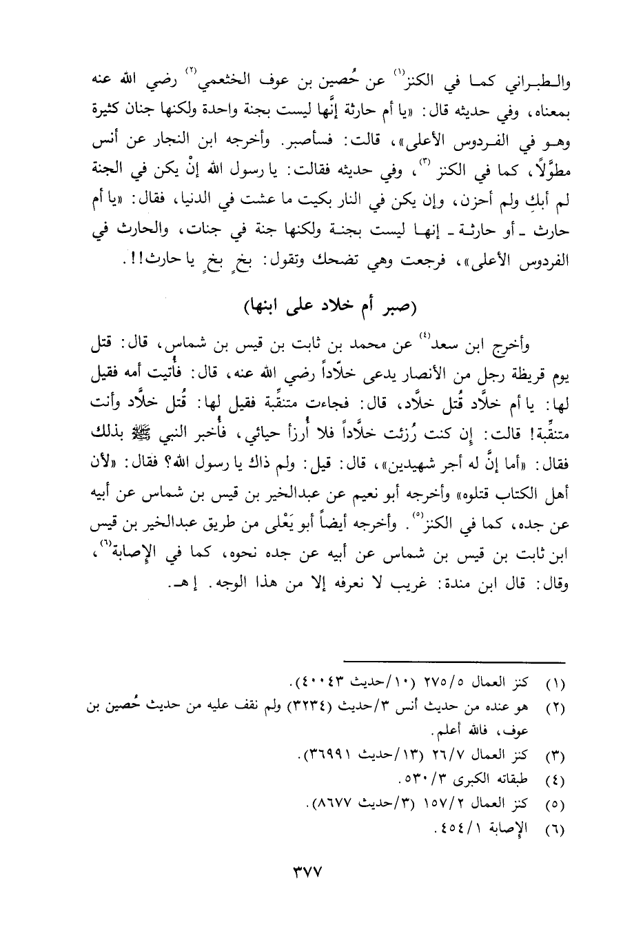 والطبراني كما في الكنز عن حصن بن عوف الخثعمي رضي الله عنه بمعناه وفي حديثه قال: «يا أم حارثة إنَّها ليست بجنة واحدة ولكنها جنان كثيرة وهو في الفردوس الأعلى» ، قالت: فسأصبر. وأخرجه ابن النجار عن أنس مطوَّلاً، كما في الكنز، وفي حديثه: فقالت: يا رسول الله إنّ يكن في الجنة لم أبكِ ولم أحزن، وإن يكن في النار بكيت ما عشت في الدنيا، فقال: «يا أم حارث - أو حارثة - إنها ليست بجنة ولكنها جنة في جنات، والحارث في الفردوس الأعلى» ، فرجعت وهي تضحك وتقول: بخٍ بخٍ يا حارث.