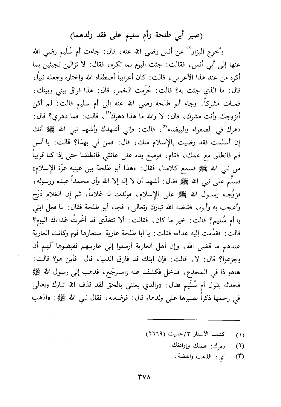 وأخرج البزار عن أنس رضي الله عنه قال: جاءت أُم سُلَيم رضي الله عنها إلى أبي أنس فقالت: جئت اليوم بما تكره، فقال: لا تزالين تجيئين بما أكره من عند هذا الأعرابي، قالت: كان أعرابياً اصطفاه الله واختاره وجعله نبياً، قال: ما الذي جئت به؟ قالت: حُرِّمت الخمر، قال: هذا فراق بيني وبينك، فمات مشركاً، وجاء أبو طلحة رضي الله عنه إلى أُم سليم قالت: لم أكن أتزوج وأنت مشرك، قال: لا والله ما هذا دهرك، قالت: فما دهري؟ قال: دهرك في الصقراء والبيضاء، قالت: فإني أشهدك وأشهد نبيَّ الله صلى الله عليه وسلم أنك إن أسلمت فقد رضي بالإِسلام منك، قال: فمن لي بهذا؟ قالت: يا أنس قم فانطلق مع عمك، فقام، فوضع يده على عاتقي فانطلقنا حتى إذا كنا قريباً من نبي الله صلى الله عليه وسلم فسمع كلامنا، فقال: «هذا أبو طلحة بين عينيه عزَّة الإِسلام» فسلَّم على نبي الله صلى الله عليه وسلم فقال: أشهد أن لا إله إلا الله وأن محمداً عبده ورسوله، فزوَّجه رسول الله صلى الله عليه وسلم على الإِسلام، فولدت له غلاماً، ثم إن الغلام دَرَج وأعجب به أبوه، فقبضه الله تبارك وتعالى، فجاء أبو طلحة فقال: ما فعل ابني يا أُم سُليم؟ قالت: خير ما كان، فقالت: ألا تتغدَّى قد أخَّرتُ غداك اليوم؟ قالت: فقدَّمت إليه غداءه فقلت: يا أبا طلحة عارية استعارها قوم وكانت العارية عندهم ما قضى الله، وإن أهل العارية أرسلوا إلى عاريتهم فقبضوها ألهم أن يجزعوا؟ قال: لا، قالت: فإن ابنك قد فارق الدنيا، قال: فأين هو؟ قالت: ما هو ذا في المخدع، فدخل فكشف عنه واسترجَع، فذهب إلى رسول الله صلى الله عليه وسلم فحدصثه بقول أُم سُلَيم فقال: «والذي بعثني بالحق لقد قذف الله تبارك وتعالى في رحمها ذكراً لصبرها على ولدها» قال: فوضعته، فقال نبي الله صلى الله عليه وسلم «اذهب