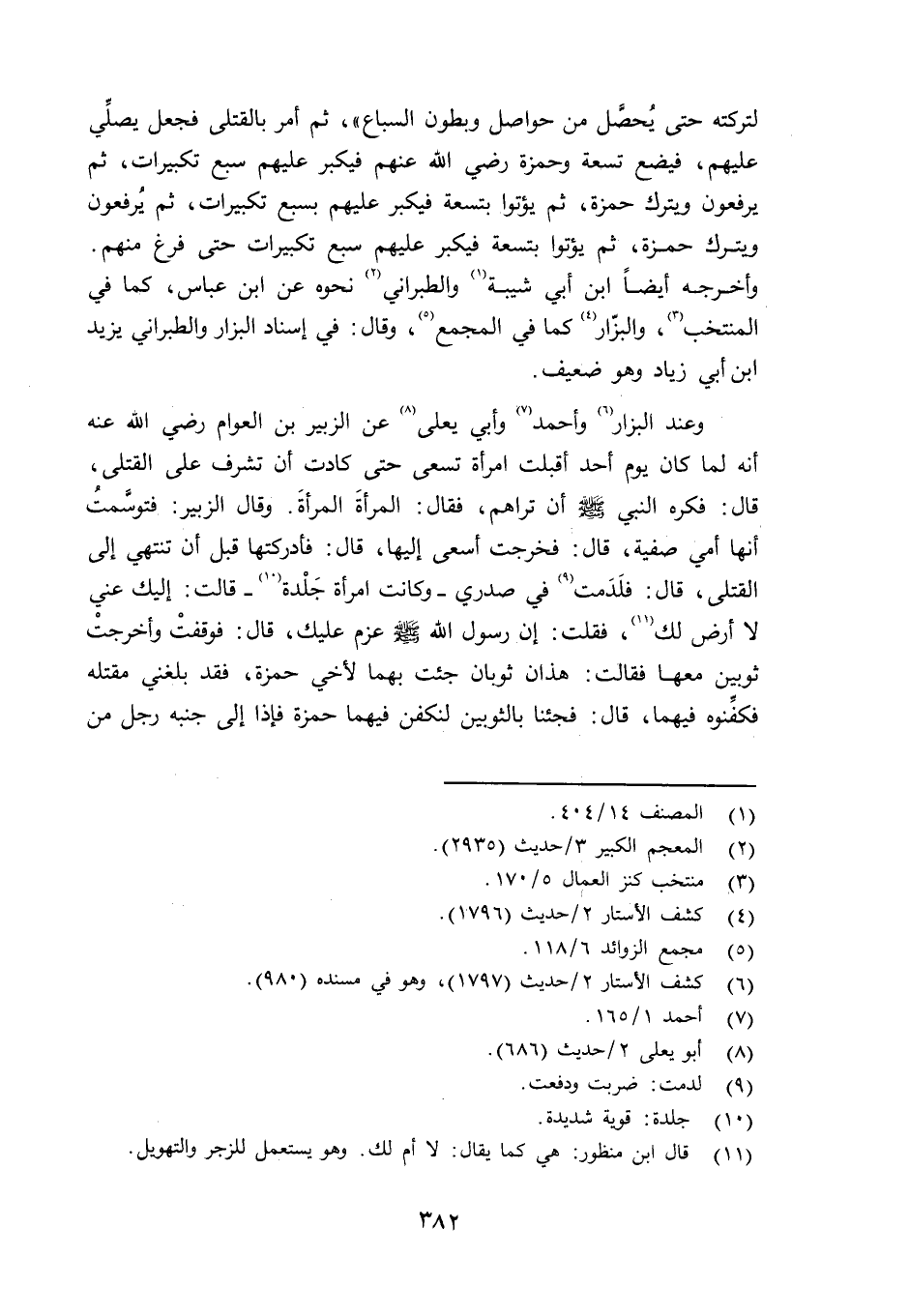 لتركته حتى يُحصَّل من حواصل الطير وبطون السباع» ، ثم أمر بالقتلى فجعل يصلِّي عليهم، فيضع تسعة وحمزة رضي الله عنهم فيكبر عليهم سبع تكبيرات، ثم يرفعون ويترك حمزة، ثم يؤتوا بتسعة فيكبر عليهم بسبع تكبيرات، ثم يرفعون ويترك حمزة، ثم يؤتوا بتسعة فيكبر عليهم سبع تكبيرات حتى فرغ منهم. وأخرجه أيضاً ابن أبي شيبة والطبراني نحوه عن ابن عباس، كما في المنتخب، والبزَّار كما في المجتمع وقال: في إسناده البزار والطبراني يزيد بن أبي زياد وهو ضعيف.