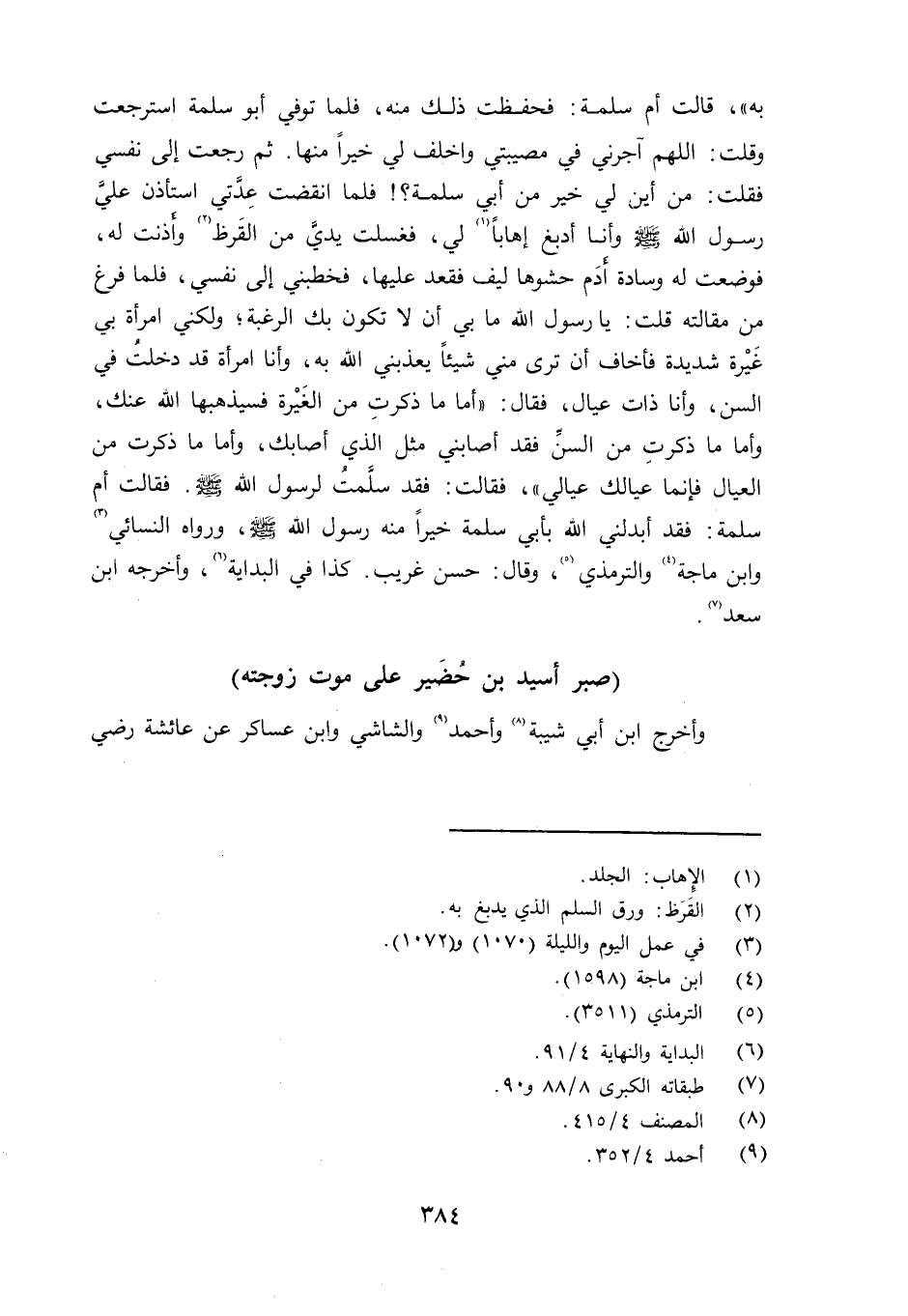 به» ، قالت أُم سلمة: فحفظت ذلك منه، فلما توفي أبو سلمة استرجعت وقلت: اللَّهمَّ آجرني في مصيبتي واخلف لي خيراً منها.l ثم رجعت إلى نفسي فقلت: من أين لي خير من أبي سلمة؟ فلما انقضت عِدَّتي استأذن عليَّ رسول الله صلى الله عليه وسلم وأنا أدبغ إهاباً لي، فغسلت يديَّ من القَرِظ وأَذنت له، فوضعت له وسادة أَدَم حشوها ليف فقعد عليها، فخطبني إلى نفسي، فلما فرغ من مقالته قلت: يا رسول الله ما بي أن لا تكون بك الرغبة؛ ولكني امرأة بي غَيْرة شديدة فأخاف أن ترى مني شيئاً يعذبني الله به، وأنا امرأة قد دخلت في السن، وأنا ذات عيال، فقال: «أما ما ذكرتِ من الغَيرة فسيُذهبها الله عنك، وأما ما ذكرت من السنِّ فقد أصابني مثل الذي أصابك، وأما ما ذكرت من العيال فإنما عيالك عيالي» ، فقالت: فقد سلَّمت لرسول الله، فقالت أُم سلمة: فقد أبدلني الله بأبي سلمة خيراً منه رسول الله صلى الله عليه وسلم ورواه النسائي وابن ماجه والترمذي وقال: حسن غريب. كذا في البداية، وأخرجه ابن سعد (863/ 64) .