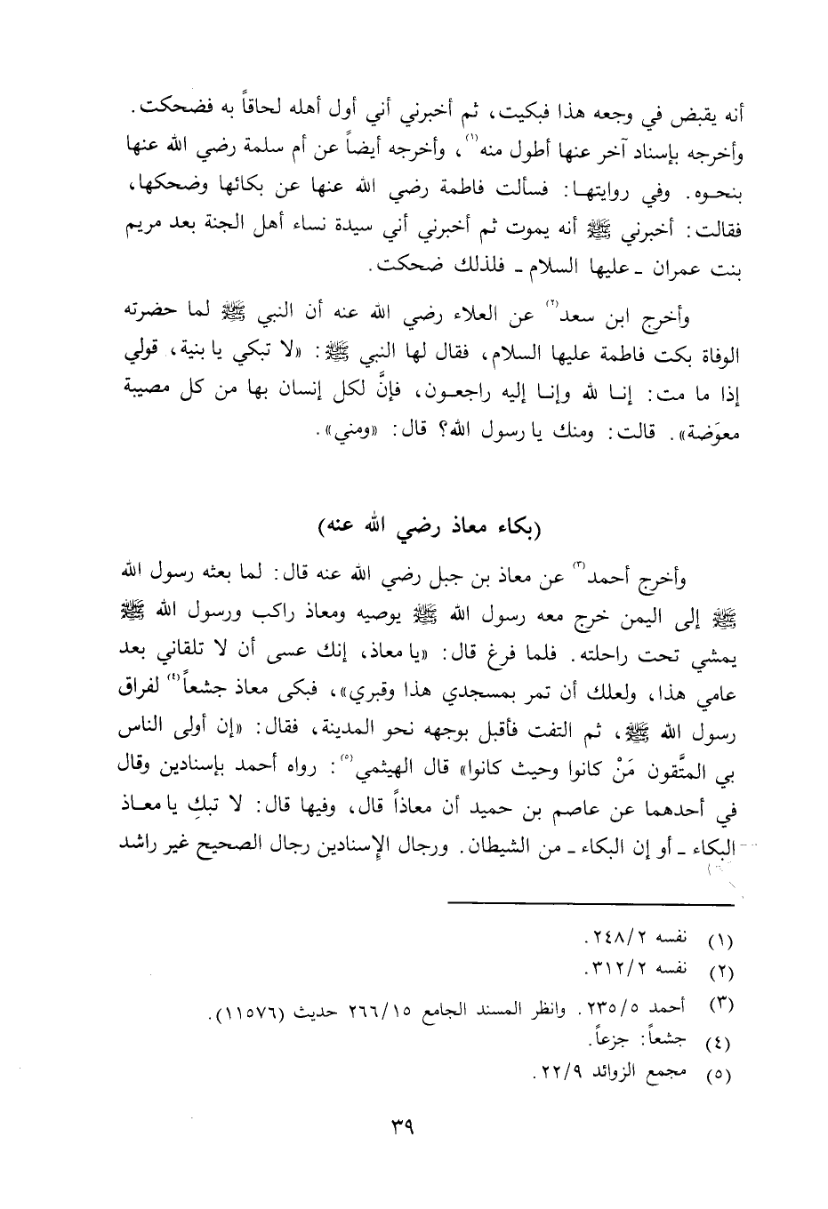 وأخرج ابن سعد عن العلاء رضي الله عنه أن النبي صلى الله عليه وسلم ما حضرته الوفاء بكيت فاطمة عليه السلام، فقال لها النبي صلى الله عليه وسلم «لا تبكي يا بنية، قولي إذا ما مت: أنا لله وإنا إليه راجعون، فإنَّ لكل إنسان بها من كل مصيبة معوَضة. قالت: ومنك يا رسول الله؟ قال: «ومني» .