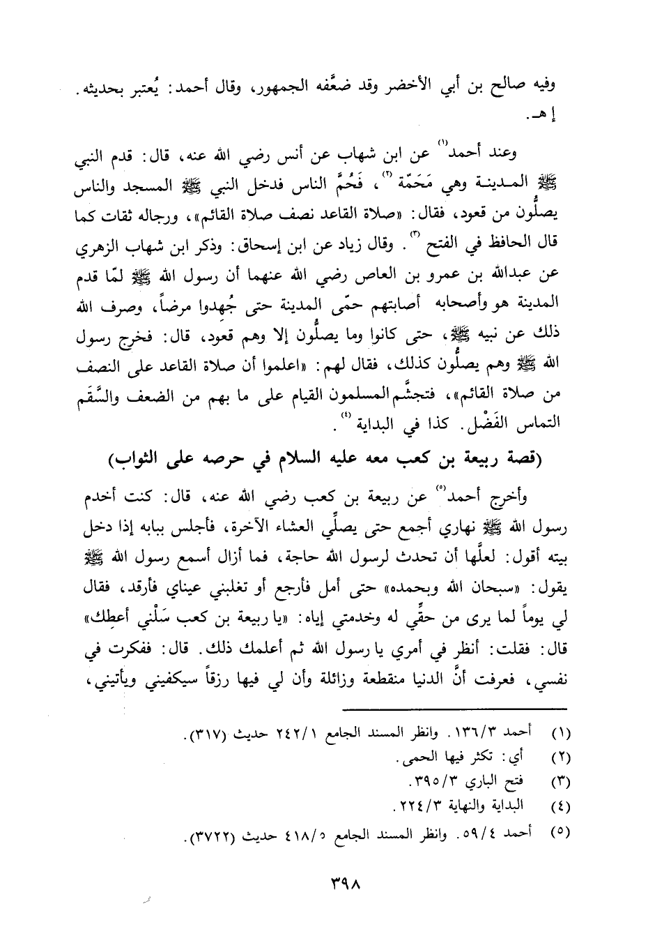 وفيه صالح بن أبي الأخضر وقد ضعَّفه الجمهور، وقال أحمد: يُعتبر بحديثه. اهـ. وعند أحمد عن ابن شهاب عن أنس رضي الله عنه قال: قدم النبي صلى الله عليه وسلم المدينة وهي مَحَمّة، فَحُمَّ الناس فدخل النبي صلى الله عليه وسلم المسجد والناس يصلُّون من قعود، فقال: «صلاة القاعد نصف صلاة القائم» ، ورجاله ثقات كما قال الحافظ في الفتح، وقال زياد عن ابن إسحاق: وذكر ابن شهاب الزهري عن عبد الله بن عمرو بن العاص رضي الله عنهما أن رسول الله صلى الله عليه وسلم لما قدم المدينة هو وأصحابه أصابتهم حمّى المدينة حتى جُهِدوا مرضاً، وصرف الله ذلك عن نبيه صلى الله عليه وسلم حتى كانوا وما يصلُّون إلا وهم قعود، قال: فخرج رسول الله صلى الله عليه وسلم وهم يصلّون كذلك، فقال لهم: «اعلموا أن صلاة القاعد على النصف من صلاة القائم» ، فتجشَّم المسلمون القيام على ما بهم من الضعف والسَّقَم التماس الفَضْل. كذا في البداية.