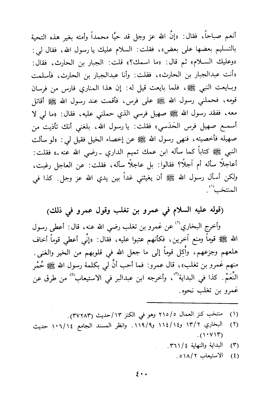 وأخرج البخاري عن عمرو بن تغلب رضي الله عنه قال: أعطى رسول الله صلى الله عليه وسلم قوماً ومنع آخرين، فكأنهم عتبوا عليه، فقال: «إنِّي أعطي قوماً أخاف هلعهم وجزعهم، وأَكِل قوماً إلى ما جعل الله في قلوبهم من الخير والغنى. منهم عمرو بن تغلب» ، قال عمرو: فما أحب أنَّ لي بكلمة رسول الله صلى الله عليه وسلم حُمْر النَّعَمْ. كذا في البداية، وأخرجه ابن عبد البر في الاستيعاب من طرق عن عمرو بن تغلب نحوه.