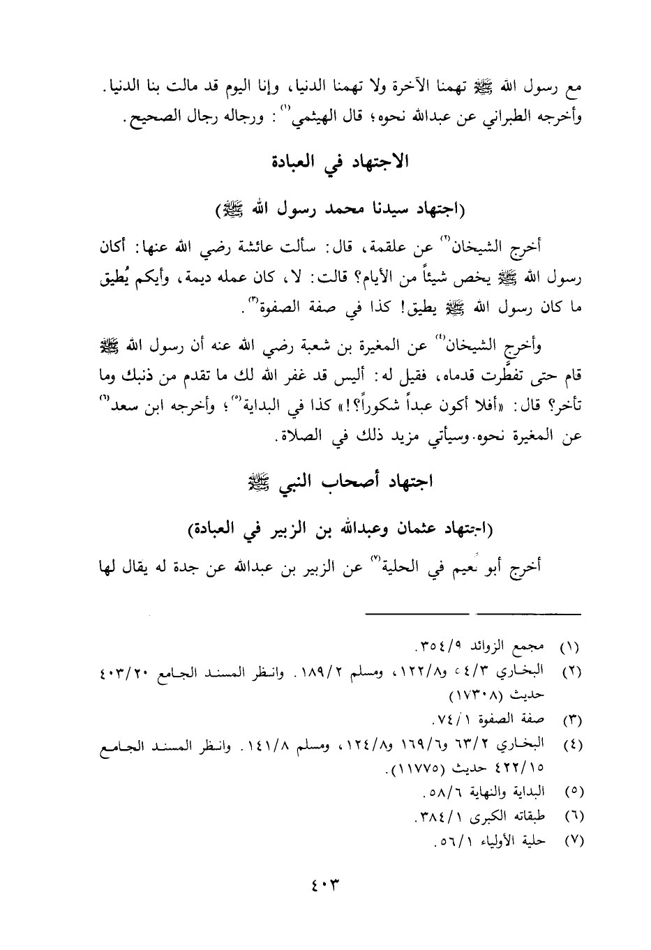 اجتهاد سيدنا محمد رسول الله صلى الله عليه وسلم أخرج الشيخان عن علقمة قال: سألت عائشة رضي الله عنها: أكان رسول الله يخص شيئاً من الأيام؟ قالت: لا، كان عمله ديمة، وأيكم يُطيق ما كان رسول الله صلى الله عليه وسلم يطيق كذا في صفة الصفوة (ص74) . وأخرج الشيخان عن المغيرة بن شعبة رضي الله عنه أن رسول الله صلى الله عليه وسلم قام حتى تفطَّرت قدماه، فقيل له: أليس قد غفر الله لك ما تقدم من ذنبك وما تأخر؟ قال: «أفلا أكون عبداً شكوراً؟» كذا في البداية؛ وأخرجه ابن سعد عن المغيرة نحوه وسيأتي مزيد ذلك في الصلاة.