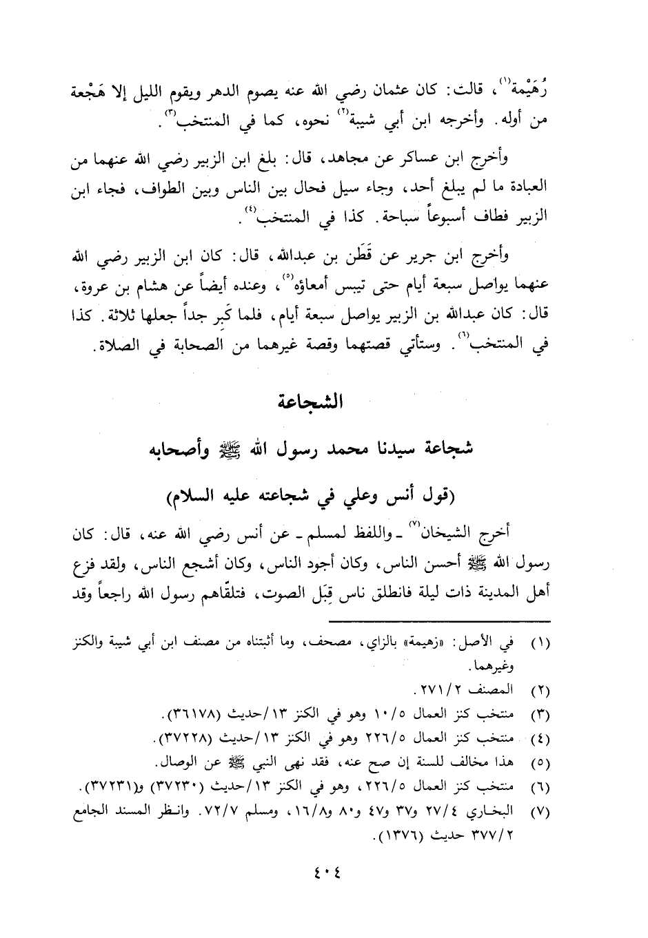 زهيمة قالت: كان عثمان رضي الله عنه يصوم الدهر ويقوم اليل إلا هَجْعة من أوله، وأجرجه ابن أبي شيبة نحوه، كما في المنتخب. وأخرج ابن عساكر عن مجاهد قال: بلغ ابن الزبير رضي الله عنهما من العادة ما لم يبلغ أحد، وجاء سيل فحال بين الناس وبين الطواف، فجاء ابن الزبير فطاف أسبوعاً سباحة. كذا في المنتخب.