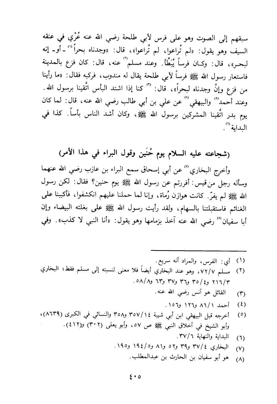 سبقهم إلى الصوت وهو على فرس لأبي طلحة رضي الله عنه عُرْي في عنقه السيف وهو يقول: «لم تُراعوا، لم تُراعوا» ، قال: «وجدناه بحراً - أو إنه لبحر» ، قال: وكان فرساً يبطَأ. وعند مسلم عنه قال: كان فزع بالمدينة فاستعار رسول الله صلى الله عليه وسلم فرساً لأبي طلحة يقال له مندوب، فركبه فقال: «ما رأينا من فزع وإنْ وجدناه لبحراً» ، قال: كنا إذا اشتد البأس اتَّقينا برسوف الله صلى الله عليه وسلم وعند أحمد والبيهقي عن علي بن أي طالب رضي الله عنه قال: لما كان يوم بدر اتَّقينا المشركين برسول الله صلى الله عليه وسلم وكان أشد الناس بأساً. وكان في البداية.