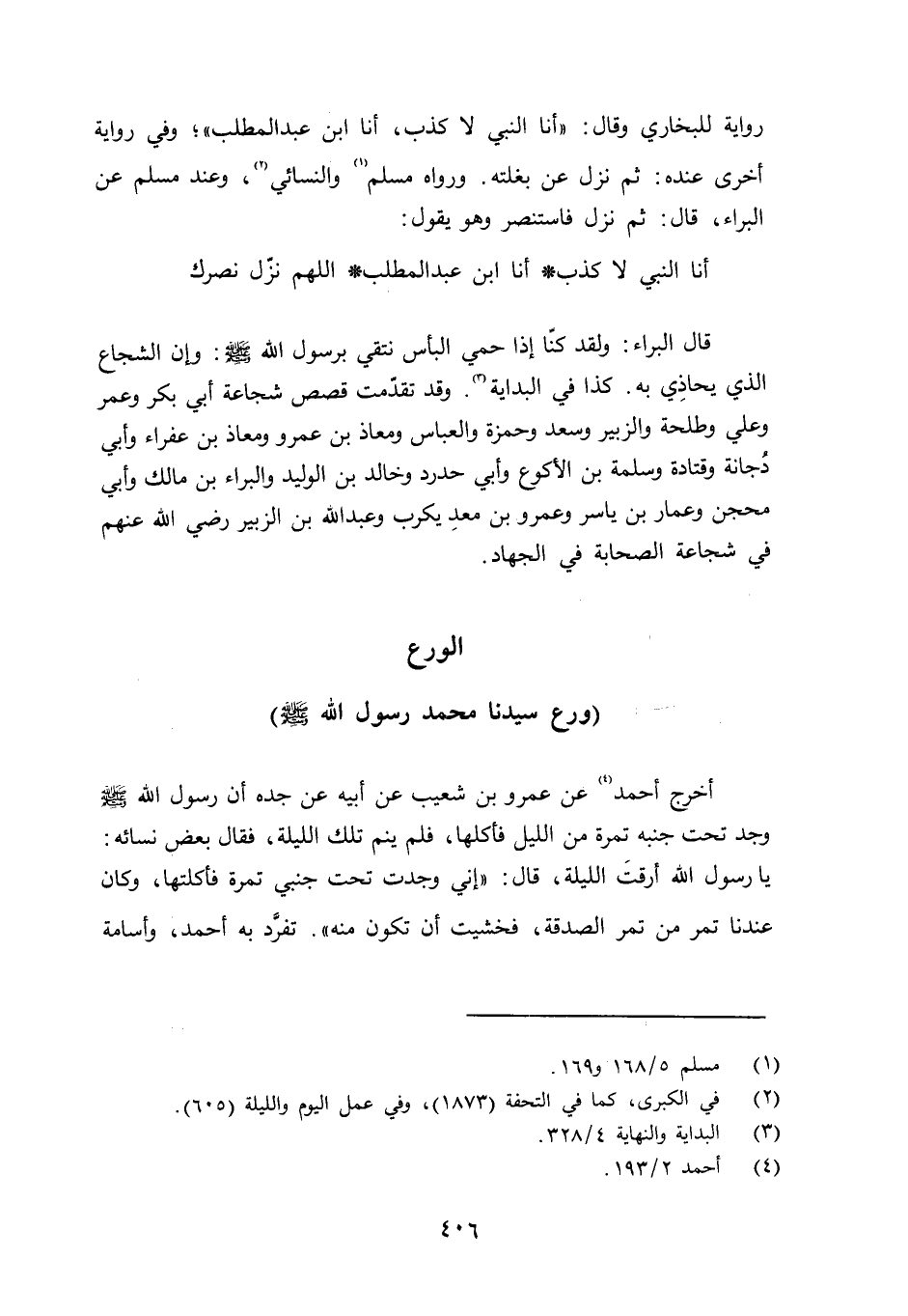 قال البراء: ولقد كنّا إذا حمي البأس نتقي برسول الله صلى الله عليه وسلم زإن الشجاع الذي يحاذِي به. كذا في البداية، وقد تقدّمت قصص شجاعة أبي بكر وعمر وعلي وطلحة والزبير وسعد وحمزة والعباس ومعاذ ابن عمرو ومعاذ بن عفراء وأبي دُجانة وقتادة وسلم ة بن الأكوع وأبي حدرد وخالد بن الوليد والبراء بن مالك وأبي محجن وعمار بن ياسر وعمرو ابن معدِيكرب وعبد الله بن الزبير رضي الله عنهم في شجاعة الصحابة في الجهاد.