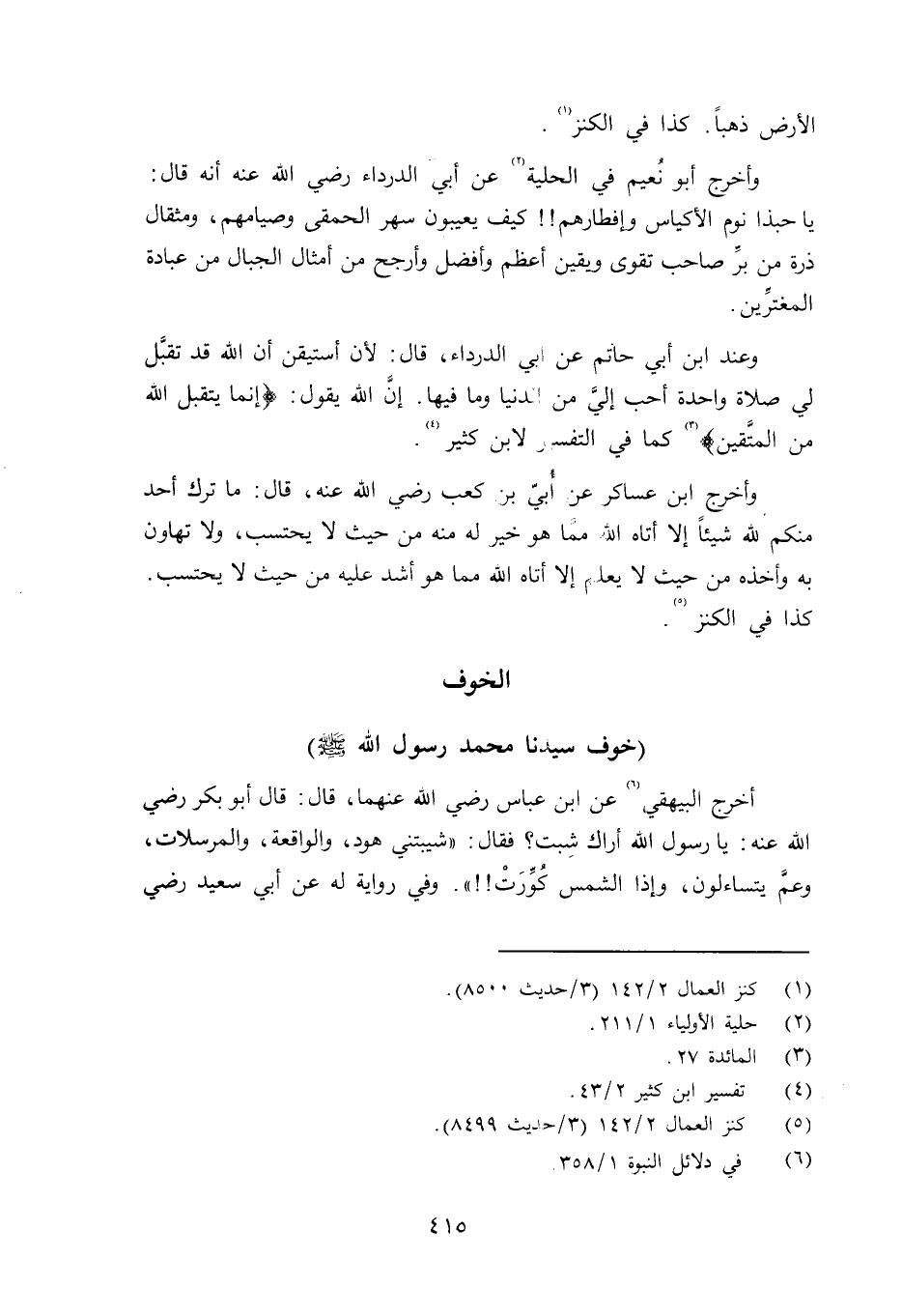 الأرض ذهباً. كذا في الكنز. وأخرج أبو نُعيم في الحلية عن أبي الدرداء رضي الله عنه أنه قال: يا حبذا نوم الأكياس وإفطارهم كيف يعيبون سهر الحمقى وصيامهم، ومثقال ذرة من برِّ صاحب تقوى ويقين أعظم وأفضل وأرجح من أمثال الجبال من عبادة المغترِّين. وعند ابن أبي حاتم عن أبي الدرداء قال: لإن أستيقن أن الله قد تقبَّل لي صلاة واحدة أحب إليَّ من الدنيا وما فيها. إنَّ الله يقول: {إِنَّمَا يَتَقَبَّلُ اللَّهُ مِنَ الْمُتَّقِينَ} (سورة المائدة، الآية: 27) كما في التفسير لابن كثير. وأخرج ابن عساكر عن أُبي بن كعب رضي الله عنه قال: ما ترك أحد منكم لله شيئاً إلا أتاه الله مما هو أشد عليه من حيث لا يحتسب. كذا في الكنز.h