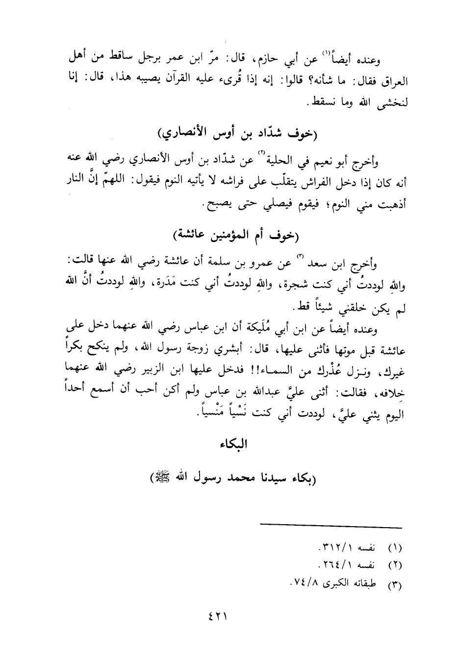 وعنده أيضاً عن أبي حازم رضي الله عنه قال: مرّ ابن عمر برجل ساقط من أهل العراق فقال: ما شأنه؟ قالوا: إنه قُرىء عليه القرآن يصيبه هذا، قال: إنا لنخشى الله وما نسقط.