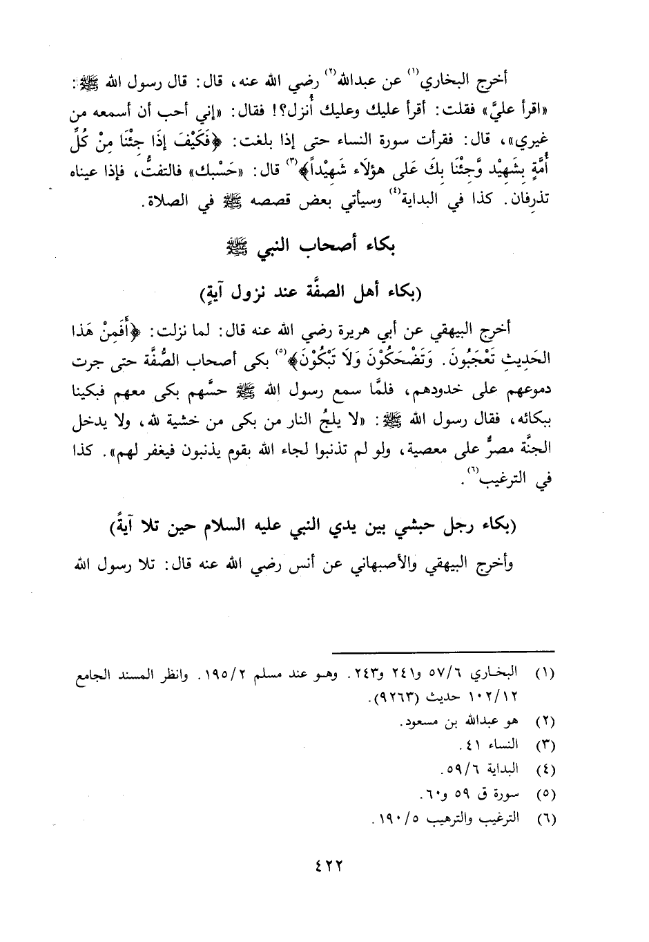أخرج البخاري عن عبد الله رضي الله عنه قال: قال رسول الله صلى الله عليه وسلم «اقرأ عليَّ» فقلت: اقرأ عليك وعليك أُنزل؟ فقال: «إني أحب أن أسمعه من غيري» ، قال: فقرأت سورة النساء حتى إذا بلغت: {فكيف إذا جئنا من كلأمة بشهيد وجئنا لك على هؤلاء شهيدا} (سورة البقرة، الآية: 24) قال: «حَسْبك» فالتفتُّ، فإذا عيناه تذرِفان. كذا في البداية وسيأتي بعض قصصه صلى الله عليه وسلم في الصلاة.