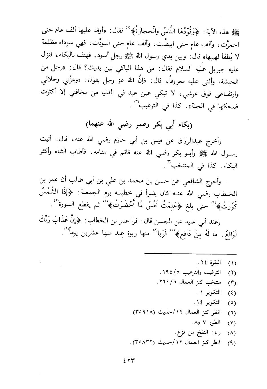وأخرج عبد الرزاق عن قيس بن أبي حازم رضي الله عنه قال: أتيت رسول الله صلى الله عليه وسلم وأبو بكر رضي الله عنه قائم في مقامه، فأطاب الثناء وأكثر البكاء. كذا في المنتحب. وأخرج الشافعي عن حسن بن محمد بن علي بن أبي طالب رضي الله عنه أن عمر بن الخطاب رضي الله عنه كان يقأ في خطبته يوم الجمعة: {إِذَا الشَّمْسُ كُوّرَتْ} (سورة التكوير، الآية: 1) حتى بلغ {عَلِمَتْ نَفْسٌ مَّآ أَحْضَرَتْ} (سورة التكوير، الآية: 14) ثم يقطع السورة. وعند أبي عبيد عن الحسن قال: قرأ عمر بن الخطاب: {إِنَّ عَذَابَ رَبّكَ لَوَاقِعٌ} {مَّا لَهُ مِن دَافِعٍ} (سورة الطور، الآيتان: 7 و8) فَرَبا منها ربوة عِيد منها عشرين يوماً.