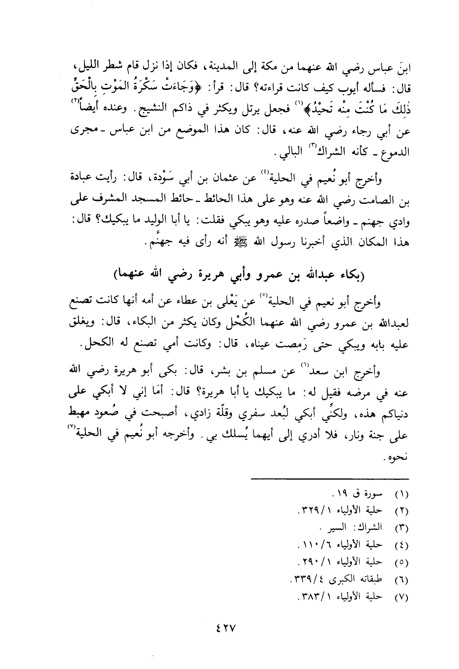 وأخرج أبو نُعيم في الحلية عن يَعْلى بن عطاء عن أمه أنها كانت تصنع لعبد الله بن عمرو رضي الله عنهما الكُحْل وكان يكثر من البكاء، قال: ويغلق عليه بابه ويبكي حتى رَمِصت عيناه، قال: وكانت أمي تصنع له الكحل. وأخرج ابن سعد عن مسلم بن بشر قال: بكى أبو هريرة رضي الله عنه في مرضه فقيل له: ما يبكيك يا أبا هريرة؟ قال: أمَا إني لا أبكي على دنياكم هذه، ولكنِّي أبكي لبُعد سفري وقلّة زادي، أصبحت في صُعود مُهْبطة على جنة ونار، فلا أدري إلى أيهما يُسلك بي؛ وأخرجه أبو نُعيم في الحلية نحوه.
