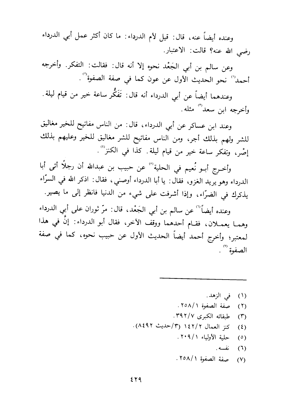 وعنده أيضاً عنه قال: قيل لأم الدرداء: ما كان أكثر عمل أبي الدرداء رضي الله عنه؟ قالت: الاعتبار. وعن سالم بن أبي الجَعْد نحوه إلا أنه قال: فقالت: التفكر، وأخرجه أحمد نحو الحديث الأول عن عون كما في صفة الصفوة، وعندهما أيضاً عن أبي الدرداء أنه قال: تفكُّر ساعة خير من قيام ليلة، وأخرجه ابن سعد مثله، وعند ابن عساكر عن أبي الدرداء قال: من الناس مفاتيح للخير مغاليق للشر ولهم بذلك أجر، ومن الناس مفاتيح للشر مغاليق للخير وعليهم بذلك إصْر، وتفكر ساعة خير من قيام ليلة. كذا في الكنز. وأخرج أبو نُعيم في الحلية عن حبيب بن عبد الله أن رجلاً أتى أبا الدرداء وهو يريد الغزو فقال: يا أبا الدرداء عن حبيب بن عبد الله أن رجلاً أتى أبا الدرداء وهو يريد الغزو فقال: يا أبا الدرداء أوصني، فقال: اذكر الله في السّراء يذكرك في الضرّاء، وإذا أشرفت على شيء من الدنيا فانظر إلى ما يصير. وعنده أيضاً عن سالم بن أبي الجَعْد قال: مرّ ثوران على أبي الدرداء وهما يعملان، فقام أحدهما ووقف الآخر فقال أبو الدرداء: إنَّ في هذا لمعتبراً؛ وأخرج أحمد أيضاً الحديث الأول عن حبيب نحوه، كما في صفة الصفوة.
