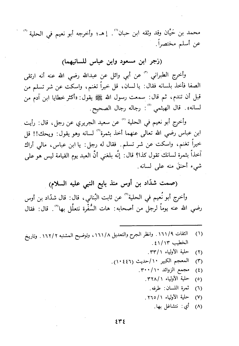وأخرج الطبراني عن أبي وائل عن عبد الله رضي الله عنه أنه ارتقى الصفا فأخذ بلسانه فقال: يا لسان، قل خيراً تغنم، واسكت عن شر تسلم من قبل أن تندم، ثم قال: سمعت رسول الله صلى الله عليه وسلم يقول: «أكثر خطايا ابن آدم من لسانه. قال الهيثمي: رجاله رجال الصحيح. وأخرج أبو نعيم في الحلية عن سعيد الجريري عن رجل قال: رأيت ابن عباس رضي الله تعالى عنهما أخذ بثمرة لسانه وهو يقول: ويحك قل خيراً تغنم، واسكت عن شر تسلم. فقال له رجل: يا ابن عباس، ما لي أراك آخذاً بثمرة لسانك تقول كذا؟ قال: إنَّه بلغني أنَّ العبد يوم القيامة ليس هو على شيء أحنقَ منه على لسانه.