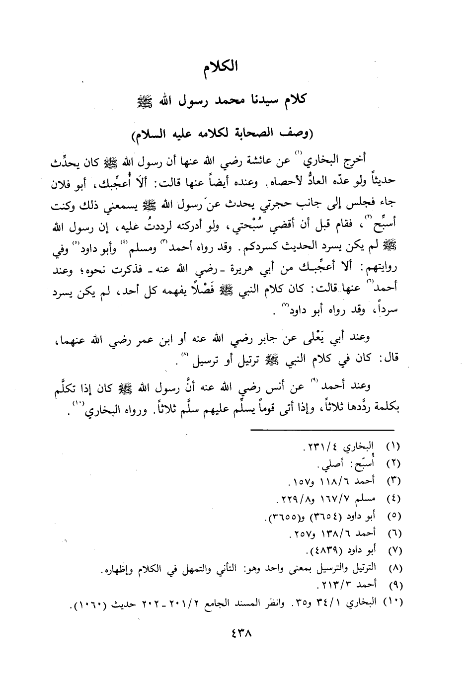 أخرج البخاري عن عائشة رضي الله عنها أن رسول الله صلى الله عليه وسلم كان يحدِّث حديثاً ولو عدّه العادُّ لأحصاه. وعنده أيضاً عنها قالت: ألا أُعجِّبك، أبو فلان جاء فجلس إلى جانب حجرتي يحدث رسول الله صلى الله عليه وسلم يسمعني ذلك وكنت أسبِّح، فقام قبل أن أقضي سبحتي، ولو أدركته لرددتُ عليه، إن رسول الله صلى الله عليه وسلم لم يكن يسرد الحديث كسردكم. وقد رواه أحمد ومسلم وأبو داود وفي روايتهم: ألا أعجِّبك من أبي هريرة - رضي الله عنه - فذكرت نحوه؛ وعند أحمد عنها قالت: كان كلام النبي صلى الله عليه وسلم فَصْلاً يفهمه كل أحد، لم يكن يسرد سرداً، وقد رواه أبو داود. وعند أبي يَعْلى عن جابر رضي الله عنه أو ابن عرم رضي الله عنهما قال: كان في كلام النبي صلى الله عليه وسلم ترتيل أو ترسيل. وعند أحمد عن أنس رضي الله عنه أنَّ رسول الله صلى الله عليه وسلم كان إذا تكلَّم بكلمة ردَّدها ثلاثاً، وإذا أتى قوماً يسلِّم عليهم ثلاثاً، رواه البخاري.
