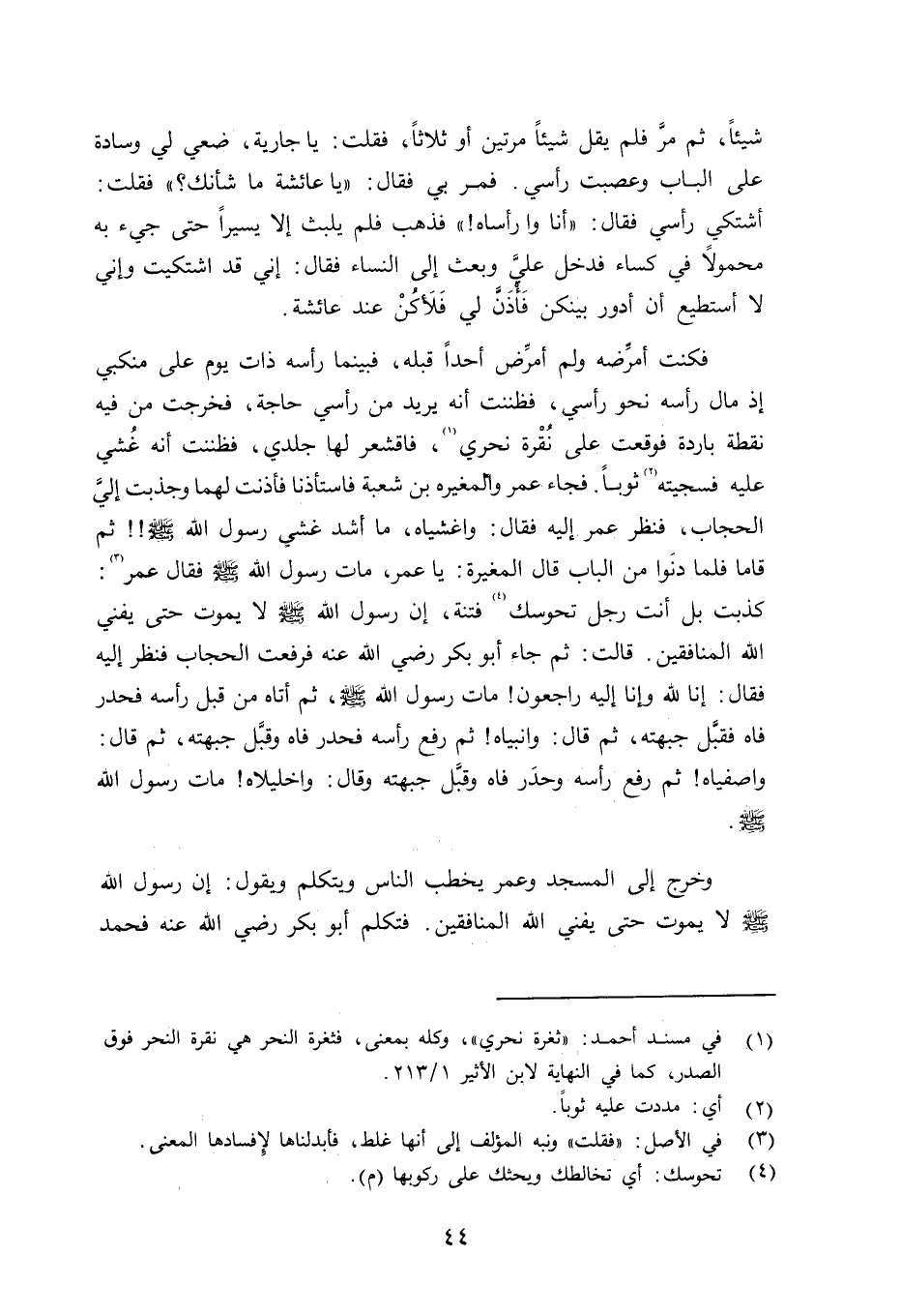 فكنت أمرِّضه ولم أمرِّض أحداً قبله، فبينما رأسه ذات يوم على منكبي إذ مال رأسه نحو رأسي، فظننت أنه يريد من رأسي حاجة، فخرجت من فيه نقطة باردة فوقعت على نقرة نحري، فاقشعر لها جلدي، فظننت أنه غُشي عليه فسجيته ثوباً. فجاء عمر والمغيرة بن شعبة فاستأذنا فأذنت لهما وجذبت إليَّ الحجاب، فنظر عمر إليه فقال: واغشياه، مات رسول الله صلى الله عليه وسلم فقلت: كذبت بل أنت رجل تحوسك فتنة، إن رسول الله صلى الله عليه وسلم لا يموت حتى يفني الله المنافقين. قالت: ثم جاء أبو بكر رضي الله عنه فرفعت الحجاب فنظر إليه فقال: إنا لله وإنا إليه راجعون مات رسول الله صلى الله عليه وسلم ثم أتاه من قبل رأسه فحدر فاه فقبَّل جبهته، ثم قال: وانبياه ثم رفع رأسه فحدر فاه وقبَّل جبهته، ثم قال: واصفياه ثم رفع رأسه وحدر فاه وقبَّل جبهته وقال: واخليلاه مات رسول الله صلى الله عليه وسلم