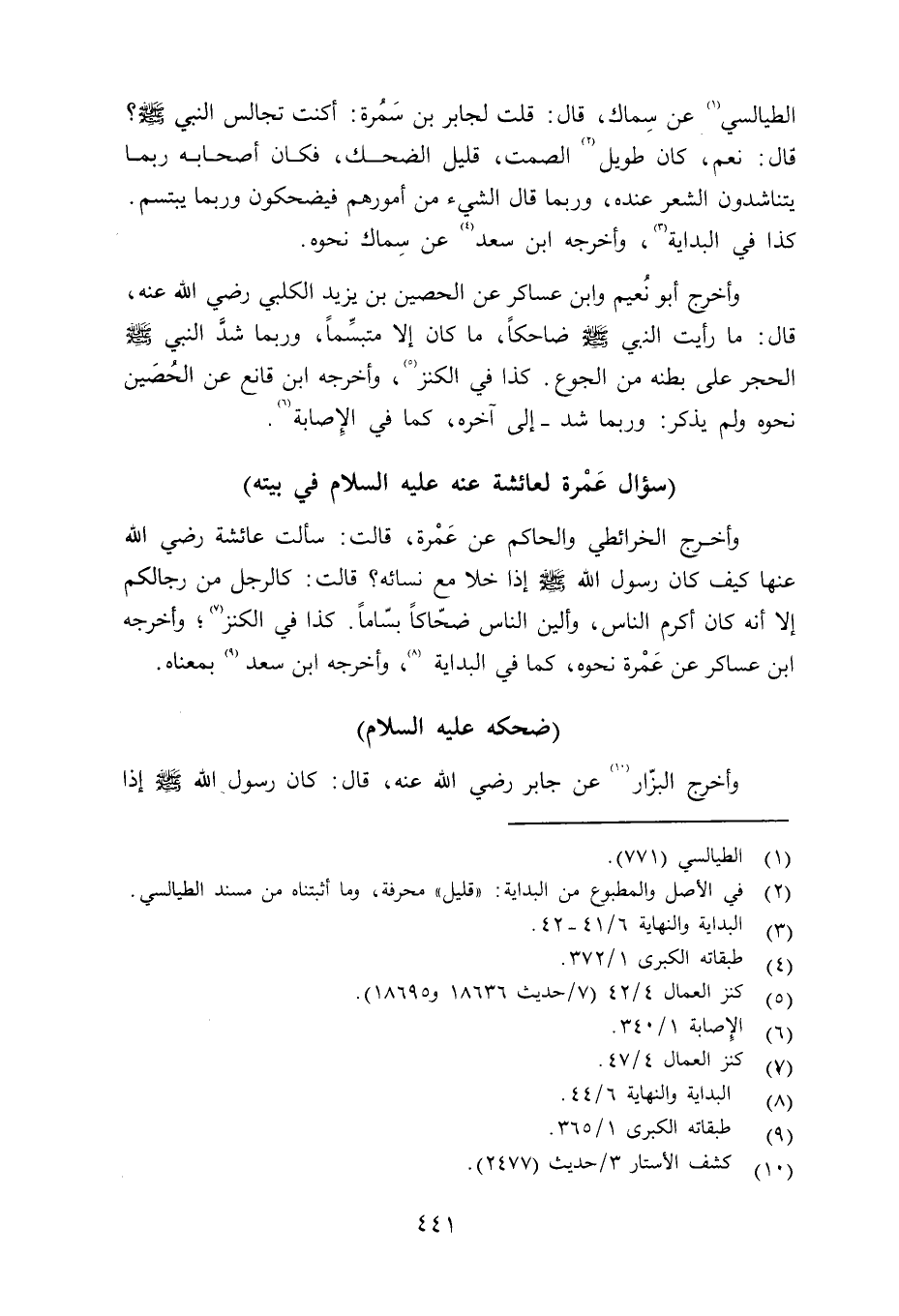 الطيالسي عن سِماك قال: قلت لجابر بن سَمُرة: أكنت تجالس النبي صلى الله عليه وسلم قال: نعم، كان قليل الصمت، قليل الضحك، فكان أصحابه ربما يتناشدون الشعر عنده، وربما قال الشيء من أمورهم فيضحكون وربما يبتسم. كذا في البداية (641 و42) ، وأخرجه ابن سعد عن سِماك نحوه.
