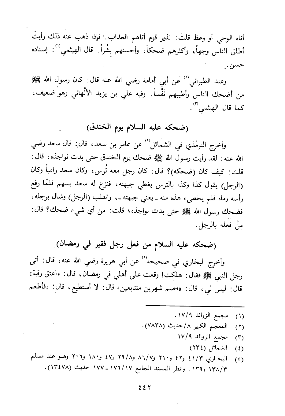 وأخرج الترمذي في الشمائل (ص16) عن عامر بن سعد قال: قال سعد رضي الله عنه: لقد رأيت رسول الله صلى الله عليه وسلم ضحك يوم الخندق حتى بدت نواجذه، قال: كيف كان (ضحكه) ؟ قال: كان رجل معه تُرس، وكان سعد رامياً وكان (الرجل) يقول كذا وكذا بالترس يغطي جبهته، فنزع له سعد بسهم فلمَّا رفع رأسه رماه فلم يخطىء هذه منه - يعني جبهته -، وانقلب (الرجل) وشال برجله. فضحك رسول الله حتى بدت نواجذه، قلت: من أي شيء ضحك؟ قال: مِنْ فعله بالرجل.