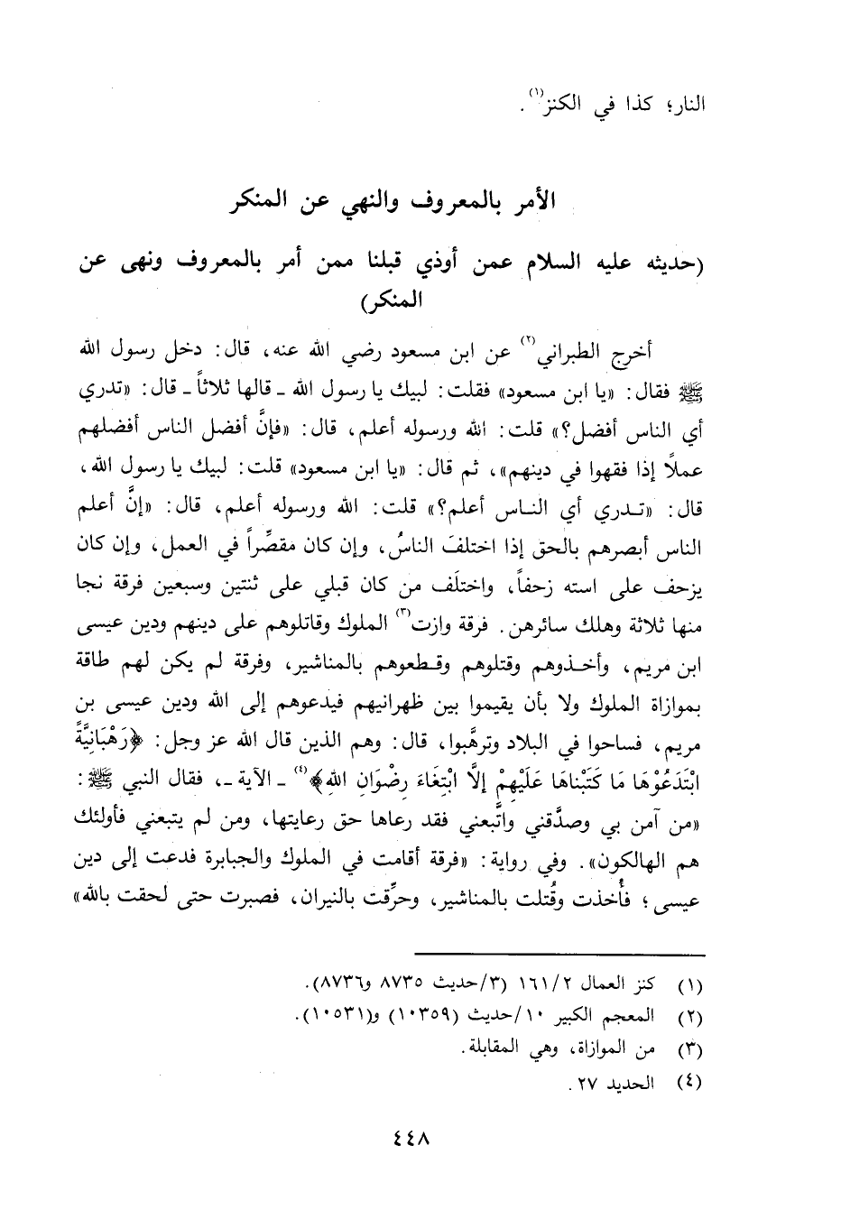 أخرج الطبراني عن ابن مسعود رضي الله عنه قال: دخل رسول الله صلى الله عليه وسلم فقال: «يا ابن مسعود» فقلت: لبيك يا رسول الله - قالها ثلاثاً - قال: «تدري أي الناس أفضل» ؟ قلت: الله ورسوله أعلم، قال: «فإنَّ أفضل الناس أفضلهم عملاً إذا فقهوا في دينهم» ، ثم قال: «يا ابن مسعود» قلت: لبيك يا رسول الله، قال: «تدري أي الناس أعلم» ؟ قلت: الله ورسوله أعلم، قال: «إنَّ أعلم الناس أبصرهم بالحق إذا اختلف الناس، وإن كان مقصِّراً في العمل، وإن كان يزحف على استه زحفاً. واختلف من كان قبلي على اثنين وسبعين فرقة نجا منها ثلاثة وهلك سائرهن. فرقة وزات الملوك وقاتلوهم على دينهم ودين عيسى بن مريم، وأخذوهم وقتلوهم وقطعوهم بالمناشير، وفرقة لم يكن لهم طاقة بموازاة الملوك ولا بأن يقيموا بين ظهرانيهم فيدعوهم إلى الله ودين عيسى بن مريم، فساحوا في البلاد وترهَّبوا، قال: وهم الذين قال الله عز وجل: {رهبانية ابتدعوها ما كتبناها عليهم إلا ابتغاء رضوان ا} - الآية -، فقال النبي صلى الله عليه وسلم «من آمن بي وصدَّقني واتَّبعني فقد رعاها حق رعايتها، ومن لم يتبعني فأولئك هم الهالكون» .t وفي رواية: «فرقة أقامت في الملوك والجبابرة فدعت إلى دين عيسى؛ وقُتلت بالمناشير، وحرِّقت بالنيران، فصبرت حتى لحقت بالله»