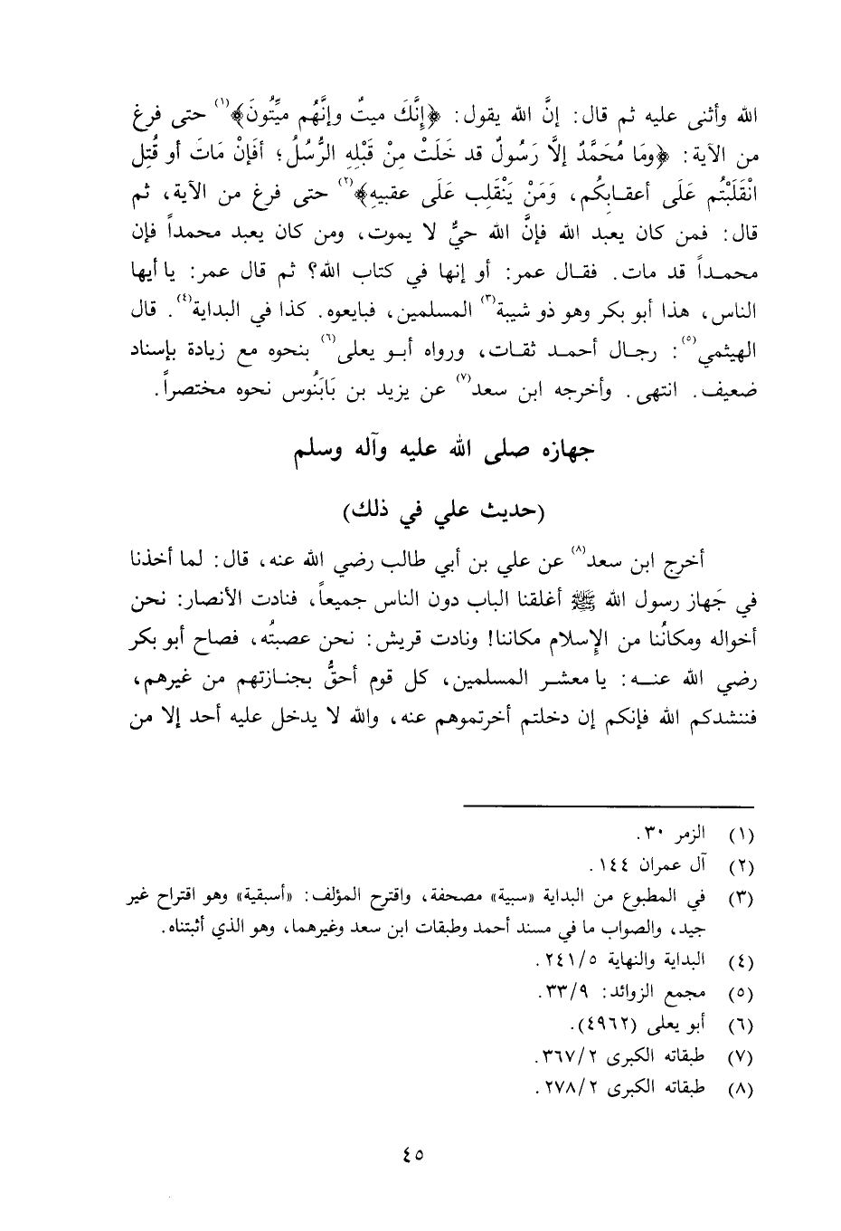 الله وأثنى عليه ثم قال: إنَّ الله يقول: {إِنَّكَ مَيّتٌ وَإِنَّهُمْ مَّيّتُونَ} (سورة الزمر، الآية: 30) حتى فرغ من الآية: {وَمَا مُحَمَّدٌ إِلاَّ رَسُولٌ قَدْ خَلَتْ مِن قَبْلِهِ الرُّسُلُ} {أَفإِيْن مَّاتَ أَوْ قُتِلَ انقَلَبْتُمْ عَلَى أَعْقَابِكُمْ} {وَمَن يَنقَلِبْ عَلَى عَقِبَيْهِ} (سورة آل عمران، الآية: 144) حتى فرغ من الآية، ثم قال: فمن كان يعبد الله فإنَّ الله حيٌّ لا يموت، ومن كان يعبد محمداً فإن محمداً قد مات. فقال عمر: أو إنها في كتاب الله؟ ثم قال عمر: يا أيها الناس، هذا أبو بكر وهو ذو سبية المسلمين، فبايعوه. كذا في البداية. قال الهيثمي: رجال أحمد ثقات. ورواه أبو يعلى بنحوه مع زيادة بإسناد ضعيف. انتهى. وأخرجه ابن سعد عن يزيد بن بَابَنُوس نحوه مختصراً.