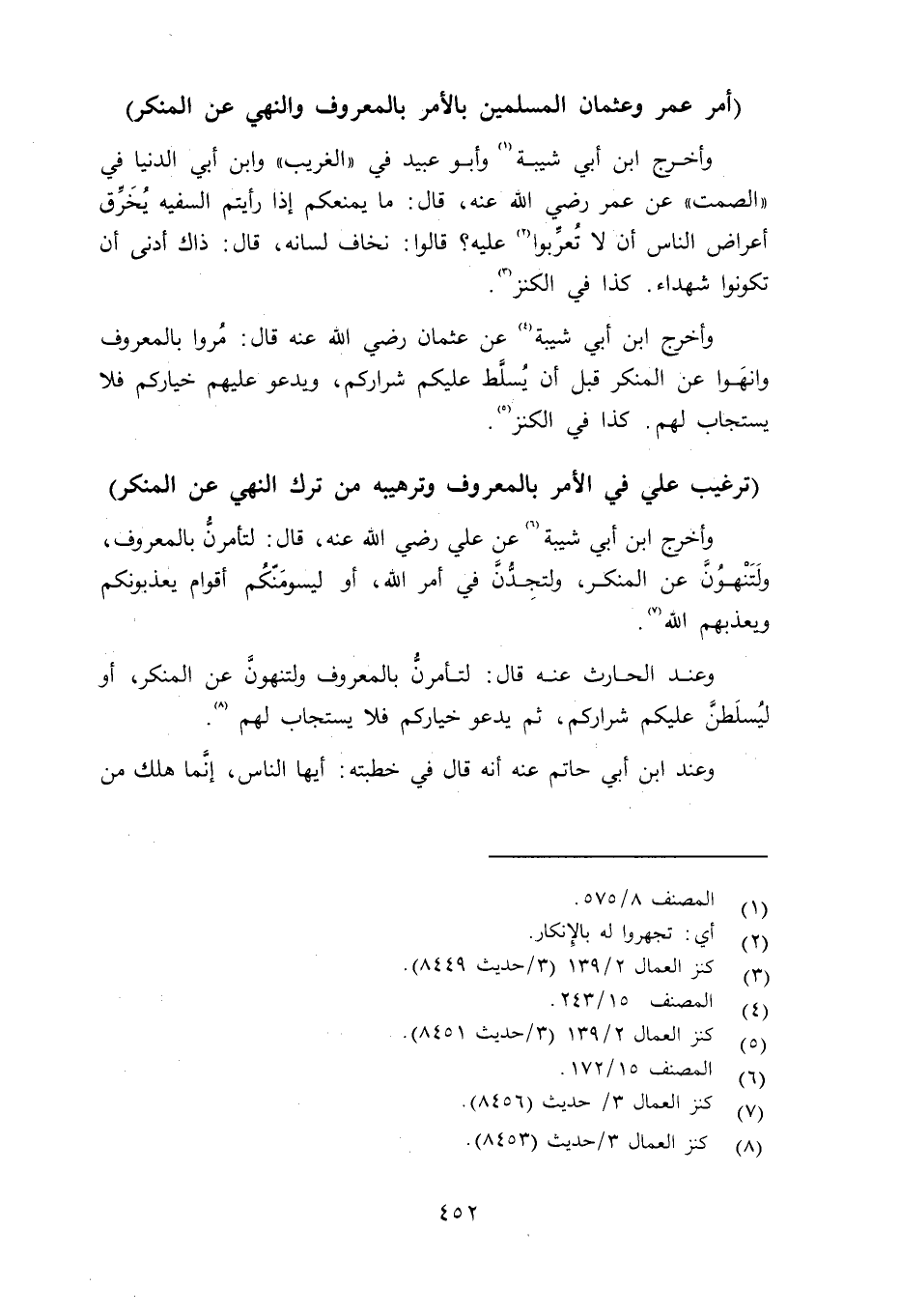 وأخرج ابن أبي شيبة عن علي رضي الله عنه قال: لتأمرنَّ بالمعروف ولَتَنْهُونَّ عن المنكر، ولتجِدُّنَّ في أمر الله، أو ليسومّنكُم أقوام يعذبونكم ويعذبهم الله. وعند الحارث قال: لتأمرنَّ بالمعروف ولتنهونَّ عن المنكر، أو ليُسلَطنَّ عليكم شراركم، ثم يدعو خياركم فلا يستجاب لهم. وعند ابن أبي حاتم عنه قال في خطبته: أيها الناس، إنَّما هلك من