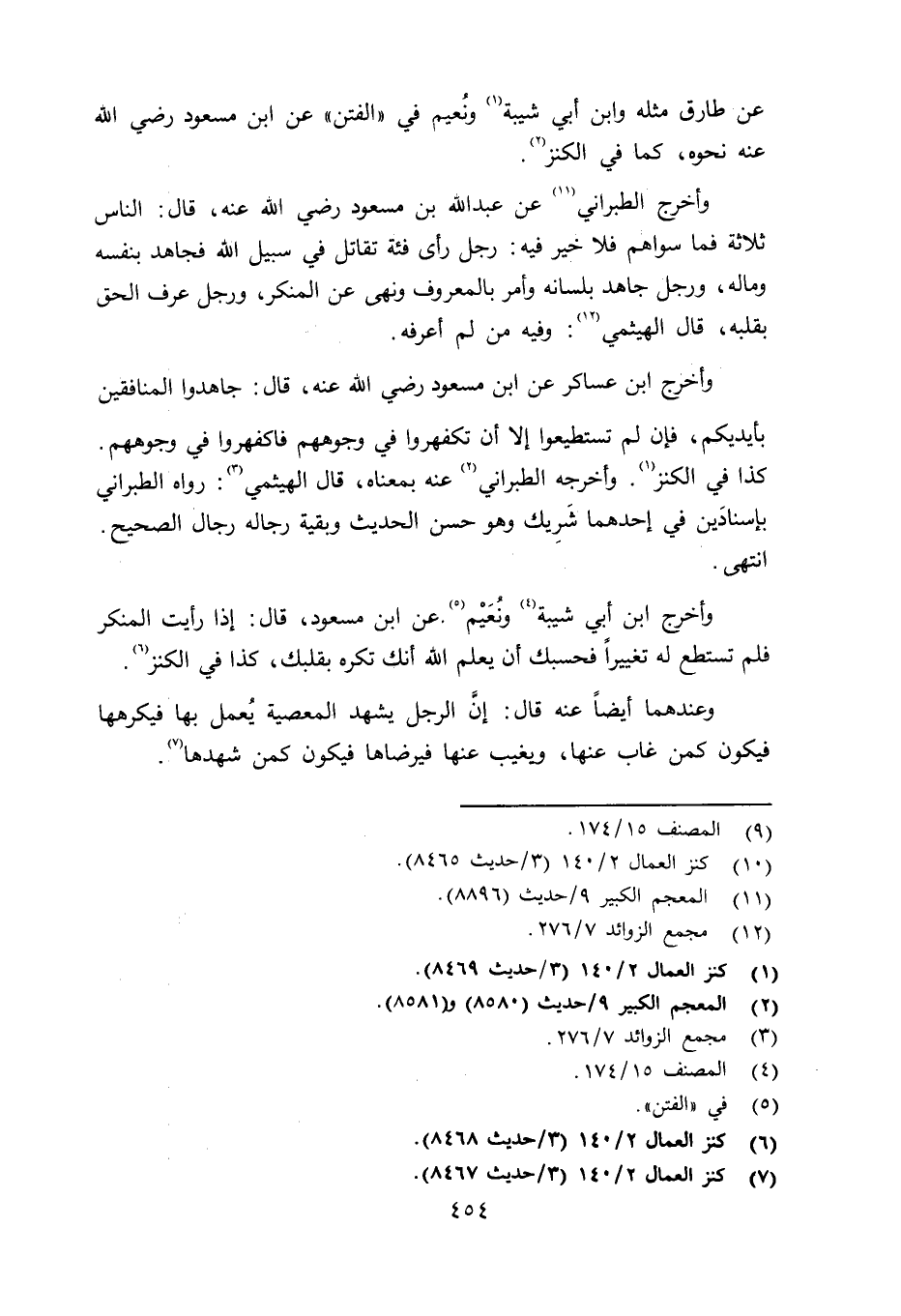 عن طارق مثله وابن أبي شيبة ونُعيم في الفتن عن ابن مسعود رضي الله عنه نحوه، كما في الكنز. وأخرج الطبراني عن عبد الله بن مسعود رضي الله عنه قال: الناس ثلاثة فما سواهم فلا خير فيه: رجل رأى فئة تقاتل في سبيل الله فجاهد بنفسه وماله، ورجل جاهد بلسانه وأمر بالمعروف ونهى عن المنكر، ورجل عرف الحق بقلبه، قال الهيثمي: وفيه من لم أعرفه. وأخرجه ابن عساكر عن ابن مسعود رضي الله عنه قال: جاهدوا المنافقين بأيديك، فإن لم تستطيعوا إلا أن تكفهروا في وجوههم فاكفهروا في وجوههم. كذا في الكنز. وأخرجه الطبراني عنه بمعناه، فقال الهيثمي: رواه الطبراني بإسنادَين في أحدهما شَريك وهو حسن الحديث وبقية رجاله رجال الصحيح. انتهى.