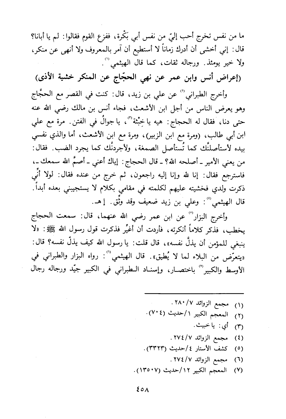 وأخرج البزار عن ابن عمر رضي الله عنهما قال: سمعت الحجاج يخطب، فذكر كلاماً أنكرته، فأردت أن أغيِّر فذكرت قول رسول الله صلى الله عليه وسلم «لا ينبغي للمؤمن أن يذلَّ نفسه» ، قال قلت: يا رسول الله كيف يذلّ نفسه؟ قال: «يتعرّض من البلاء لما لا يُطيق» . قال الهيثمي: رواه البزار والطبراني في الأوسط والكبير باختصار، وإسناد الطبراني في الكبير جيّد ورجاله رجال