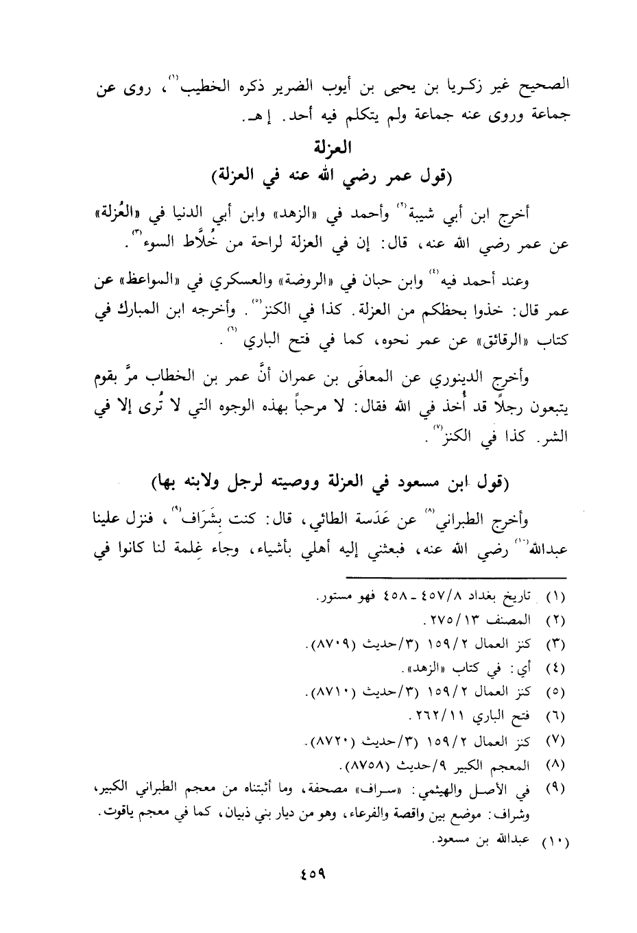 أخرج ابن أبي شيبة وأحمد في الزهد وابن أبي الدنيا في العزلة عن عمر رضي الله عنه قال: إن في العزلة لراحة من خلاط السوء. وعند أحدم فيه وابن حبان في الروضة والعسكري في المواعظ عن عمر قال: خذوا بحظكم من العزلة. كذا في الكنز. وأخرجه ابن المبارك فيكتاب الرقائق عن عمر نحوه، كما في فتح الباري. وأخرجه الدينوري عن المعافى بن عمران أنَّ عمر بن الخطاب مرَّ بقوم يتبعون رجلاً قد أُخذ في الله فقال: لا مرحباً الوجوه التي لا تُرى إلا في الشر. كذا في الكنز.