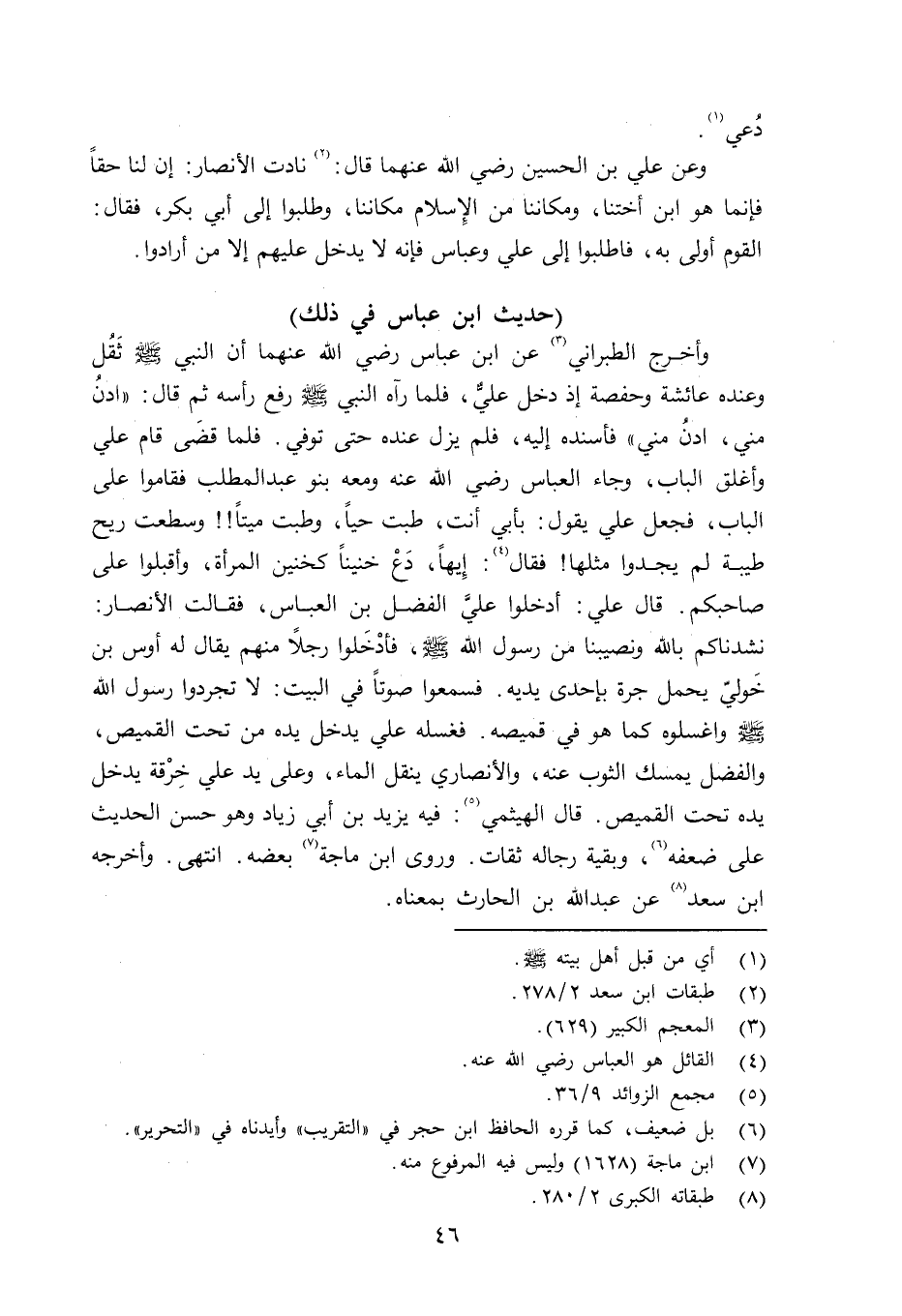 دُعي. وعن علي بن الحسين رضي الله عنهما قال: نادت الأنصار: إن لنا حقاً فإنما هو ابن أختنا، ومكاننا في الإِسلام مكاننا، وطلبوا إلى أبي بكر، فقال: القوم أولى به، فاطلبوا إلى علي وعباس فإنه لا يدخل عليهم إلا من أرادوا.