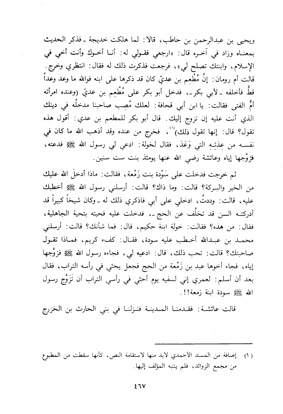 ويحيى بن عبد الرحمن بن حاطب قالا: لما هلكت خديجة - فذكر الحديث بمعناه وزاد في آخره قال: «راجعي فقولي له: أنا أخوك وأنت أخي في الإسلام، وابنتك تصلح لي» ، فرجعت فذكرت ذلك له فقال: انتظري وخرج، قالت أم رومان: إنَّ مُطْعِم بن عديّ كان قد ذكرها على ابنه (جبير ووعده) فوالله ما