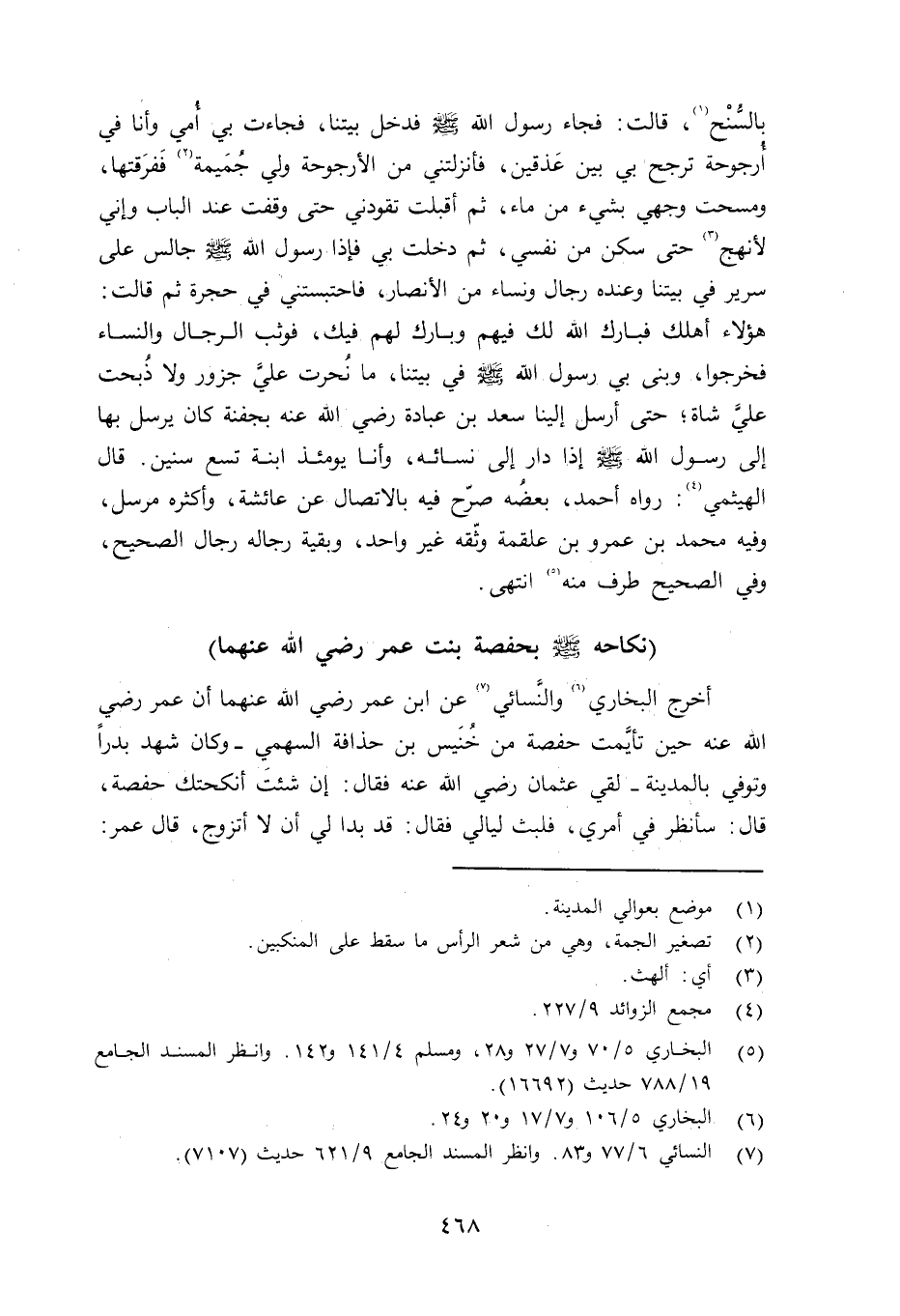 بالسُّنُح، قالت: فجاء رسول الله صلى الله عليه وسلم فدخل بيتنا، فجاءت بي أُمي وأنا في أُرجوحة ترجح بي بين عَذقين، فأنزلتني من الأرجوحة ولي جُمَيمة ففرَّقتها، ومسحت وجهي بشيء من ماء، ثم أقبلت تقودني حتى وقفت عند البابو إني لأنهج حتى سكن من نفسي، ثم دخلت بي فإذا رسول الله صلى الله عليه وسلم جالس على سرير في بيتنا وعنده رجال ونساء من الأنصار، فاحتبستني في حجرة ثم قالت: هؤلاء أهلك فبارك الله لك فيهم وبارك لهم فيك، فوثب الرجال والنساء فخرجوا، وبنى بي رسول الله صلى الله عليه وسلم في بيتنا، ما نُحرت عليَّ جزور ولا ذُبحت عليَّ شاة؛ حتى أرسل إلينا سعد بن عبادة رضي الله عنه بجفنة كانَ يرسل بها إلى رسول الله صلى الله عليه وسلم إذا دار إلى نسائه، وأنا يومئذ ابنة سبع سنين. قال الهيثمي: رواه أحمد، بعضُه صرّح فيه بالاتصال عن عائشة، وأكثره مرسل، وفيه محمد بن عمرو بن علقمة وثّقه غير واحد، وبقية رجاله رجال الصحيح، وفي الصحيح طرف منه. انتهى.
