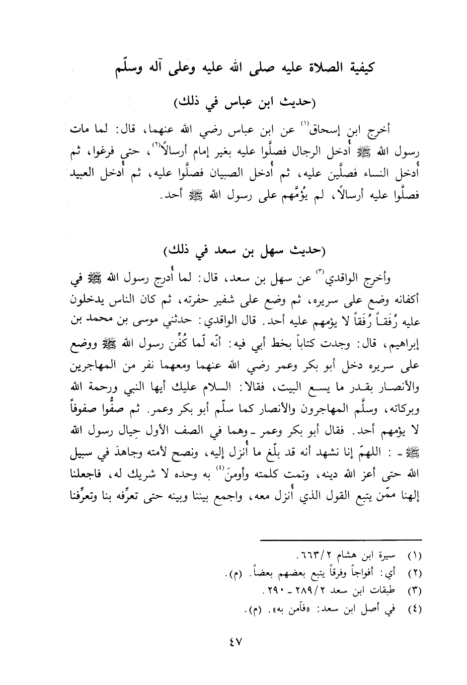 وأخرج الواقدي عن سهل بن سعد قال: لما أُدرج رسول الله صلى الله عليه وسلم في أكفانه وضع على سريره، ثم وضع على شفير حفرته، ثم كان الناس يدخلون عليه رفقاء رفقاء لا يؤمهم عليه أحد. قال الواقدي: حدثني موسى بن محمد بن إبراهيم قال: وجدت كتاباً بخط أبي فيه: أنه لمّا كُفِّن رسول الله صلى الله عليه وسلم ووضع على سريره دخل أبو بكرو عمر رضي الله عنهما ومعهما نفر من المهاجرين والأنصار بقدر ما يسع البيت، فقالا: السلام عليك أيها النبي ورحمة الله وبركاته، وسلَّم المهاجرون والأنصار كما سلم أبو بكر وعمر. ثم صفُّوا صفوفاً لا يؤمهم أحد. فقال أبو بكر وعمر - وهما في الصف الأول حِيال رسول الله صلى الله عليه وسلم ـ: اللهم إنا نشهد أنه قد بلّغ ما أنزل إليه، ونصح لأمته وجاهد في سبيل الله حتى أعز الله دينه، وتمت كلمته وأومنَ به وحده لا شريك له، افجعلنا إلهنا ممن يتبع القول الذي أُنزل معه، وأجمع بيننا وبينه حتى تعرِّفه بنا وتعرِّفنا