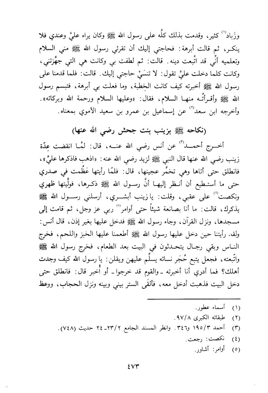 أخرج أحمد عن أنس رضي الله عنه قال: لمَّا انقضت عِدَّة زينب رضي الله عنها قال النبي صلى الله عليه وسلم لزيد رضي الله عنه: «اذهب فاذكرها عليَّ» ، فانطلق حتى أتاها وهي تخمِّر عجينها، قال: فلَّما رأيتها عَظُمت في صدري حتى ما أستطيع أن أنظر إليها أنَّ رسول الله صلى الله عليه وسلم ذكرها، فولَّيتها ظهري ونكصت على عقبي، وقلت: يا زينب أبشري، أرسلني رسول الله صلى الله عليه وسلم يذكرك، قالت: ما أنا بصانعة شيئاً حتى أوامر ربي عز وجل، ثم قامت إلى مسجدها، ونزل القرآن، وجاء رسول الله صلى الله عليه وسلم فدخل عليها بغير إذن، قال أنس: ولقد رأيتنا حين دخل عليها رسول الله صلى الله عليه وسلم أطعمنا عليها الخبز واللحم، فخجر الناس وبقي رجال يتحدثون في البيت بعد الطعام، فخرج رسول الله صلى الله عليه وسلم واتّبعته، فجعل يتبع حُجَر نسائه يسلَّم عليهن ويقلن: يا رسول الله كيف وجدت أهلك؟ فما أدري أنا أخبرته - والقوم قد خرجوا - أو أُخبر قال: فانطلق حتى دخل البيت فذهبت أدخل معه، فألقَى الستر بيني وبينه ونزل الحجاب، ووعُظ