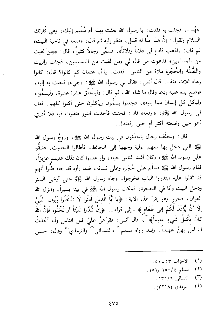 قال: وتخلّف رجال يتحدّثون في بيت رسول الله صلى الله عليه وسلم زوجُ رسول الله صلى الله عليه وسلم التي دخل به معهم مولية وجهها إلى الحائط، فأطالوا الحديث، فشقُّوا على رسول الله صلى الله عليه وسلم وكان أشد الناس حياء، ولو علموا كان ذلك عليهم عزيزاً، فقام رسول الله صلى الله عليه وسلم فسلَّم عى حُجَره وعلى نسائه، فلما رأوه قد جاء ظنُّوا أنهم قد ثقلوا عليه ابتدروا الباب فخرجوا، وجاء رسول الله صلى الله عليه وسلم حتى أرخى السرت ودخل البيت وأنا في الحجرة، فمكث رسول الله صلى الله عليه وسلم في بيته يسيراً، وأنزل الله القرآن، فخرج وهو يقرأ هذه الآية: {يأَيُّهَا الَّذِينَ ءامَنُواْ لاَ تَدْخُلُواْ بُيُوتَ النَّبِىّ إِلاَّ أَن يُؤْذَنَ لَكُمْ إِلَى طَعَامٍ} - إلى قوله: {إن تبدو شيئا أو تخفوه فإن اكان بكل شيء عليما} (سورة الأحزاب، الآيتان: 53 و54) ، قال أنس: فقرأهنَّ عليَّ قبل الناس وأنا أحْدَثُ الناس بهنَّ عهداً. وقد رواه مسلم والنسائي الترمذي وقال: حسن