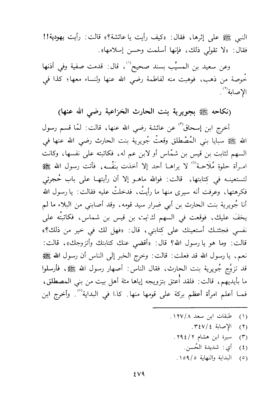 أخرج ابن إسحاق عن عائشة رضي الله عنها قالت: لمّا قسم رسول الله صلى الله عليه وسلم سبايا بني المُصْطلق وقعتْ جُويرية بنت الحارث رضي الله عنها في السهم لثابت بن قيس بن شمّاس أو لابن عم له، فكاتبته على نفسها، وكانت امرأة حلوة مُلاَحة لا يراها أحد إلا أخذت بنَفْسه، فأتت رسول الله صلى الله عليه وسلم لتستعينه في كِتابتها، قالت: فوالله ما هو إلا أن رأيتها على باب حُجرتي فكرهتها، وعرفت أنه سيرى منها ما رأيتُ، فدخلتْ عليه فقالت: يا رسول الله أنا جُويرية بنت الحارث بن أبي ضِرار سيد قومه، وقد أصابني من البلاء ما لم يخفَ عليك، فوقعت في السهم لثابت بن قيس بن شماس، فكاتبتُه على نفسي فجئتك أتسعينك على كِتابتي، قال: «فهل لك في خير من ذلك؟» قالت: وما هو يا رسول الله؟ قال: «أقضي عنك كتابتك وأتزوجك» ، قالت: نعم، يا رسول الله قد فعلت. قالت: وخرج الخبر إلى الناس أن رسول الله صلى الله عليه وسلم قد تزوَّج جُويرية بنت الحارث، فقال الناس: أصهار رسول الله صلى الله عليه وسلم فأرسلوا ما بأيديهم، قالت: فلقد أُعتق بتزويجه إياها مائة أهل بيت من بني المصطلق، فما أعلم امرأة أعظم بركة على قومها منها. كذا في البداية. وأخرج ابن