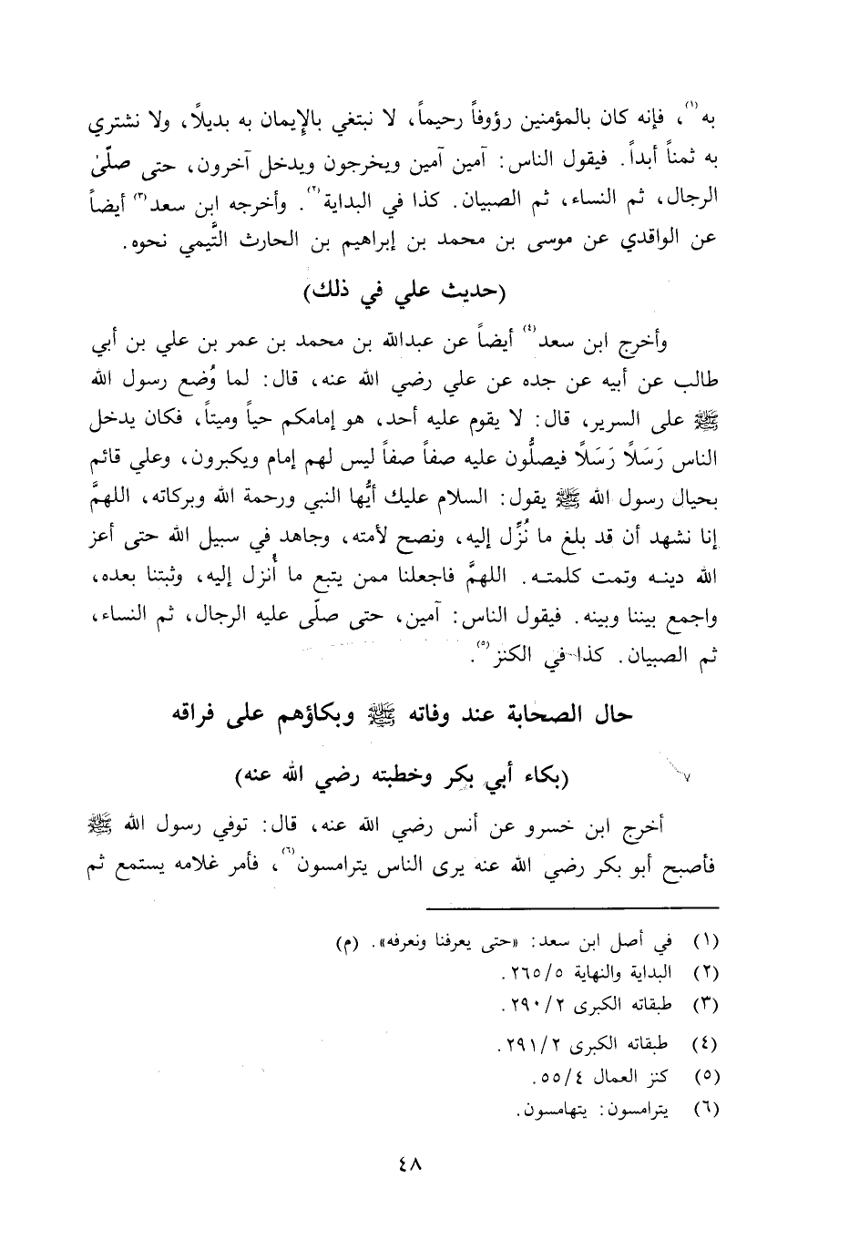 وأخرج ابن سعد أيضاً عن عبد الله بن محمد بن عمر بن علي بن أبي طالب عن أبيه عن جده عن علي رضي الله عنه قال: لما وُضِع رسول الله صلى الله عليه وسلم على السري قال: لا يقوم عليه أحد، هو إمامكم حياً وميتاف، فكان يدخل الناس رسلاً رَسَلاً فيصلُّون عليه صفاً صفاً ليس لهم إمام ويكبرون، وعلي قائم بحيال رسول الله صلى الله عليه وسلم يقول: السلام عليك أيُّها النبي ورحمة الله وبركاته، اللهمَّ إن نشهد أن قد بلغ ما نُزِّل إليه، ونصح لأمته، وجاهد في سبيل الله حتى أعز الله دينه وتمت كلمته. اللهمَّ فاجعلنا ممن يتبع ما أُنزل إليه، وثبتنا بعده، وأجمع بيننا وبينه. فيقول الناس: آمين، حتى صلّى عليه الرجال، ثم النساء، ثم الصبيان. كذا في الكنزل.