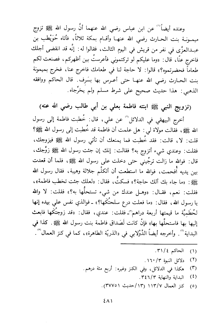 أخرج البيهقي في الدلائل عن علي قال: خُطبت فاطمة إلى رسول الله صلى الله عليه وسلم فقالت مولاة لي: هل علمت أن فاطمة قد خُطبت إلى رسول الله صلى الله عليه وسلم قلت: لا، قالت: فقد خُطبت فما يمنعك أن تأتي رسول الله صلى الله عليه وسلم فيزوجك، فقلت: وعندي شيء أتزوج به؟ فقالت: إنك إن جئت رسول الله صلى الله عليه وسلم زوَّجك، قال: فوالله ما زالت ترجِّيني حتى دخلت على رسول الله صلى الله عليه وسلم فلما قعدت بين يديه أُفحمت، فوالله ما استطعت أن أتكلَّم جلالة وهيبة، فقال رسول الله صلى الله عليه وسلم «ما جاء بك ألك حاجة؟» فسكتُّ، فقال: «لعلك جئت تخطب فاطمة» ، فقلت: نعم، فقال: «وهل عندك من شيء تستحلُّها؟» فقلت: لا والله يا رسول الله، فقال: «ما فعلت درع سلحتُكَها؟» - فوالذي نفس علي بيده إنها لحُطَمِيَّة ما قيمتها أربعة دراهم - فقلت: عندي، فقال: «قد زوجتَكَها فابعث إليها بها فاستحلَّها بها» فإنْ كانت لَصَداق فاطمة بنت رسول الله صلى الله عليه وسلم كذا في البداية. وأخرجه أيضاً الدَّوْلابي في الذريّة الطاهرة، كما في كنزل العمال.
