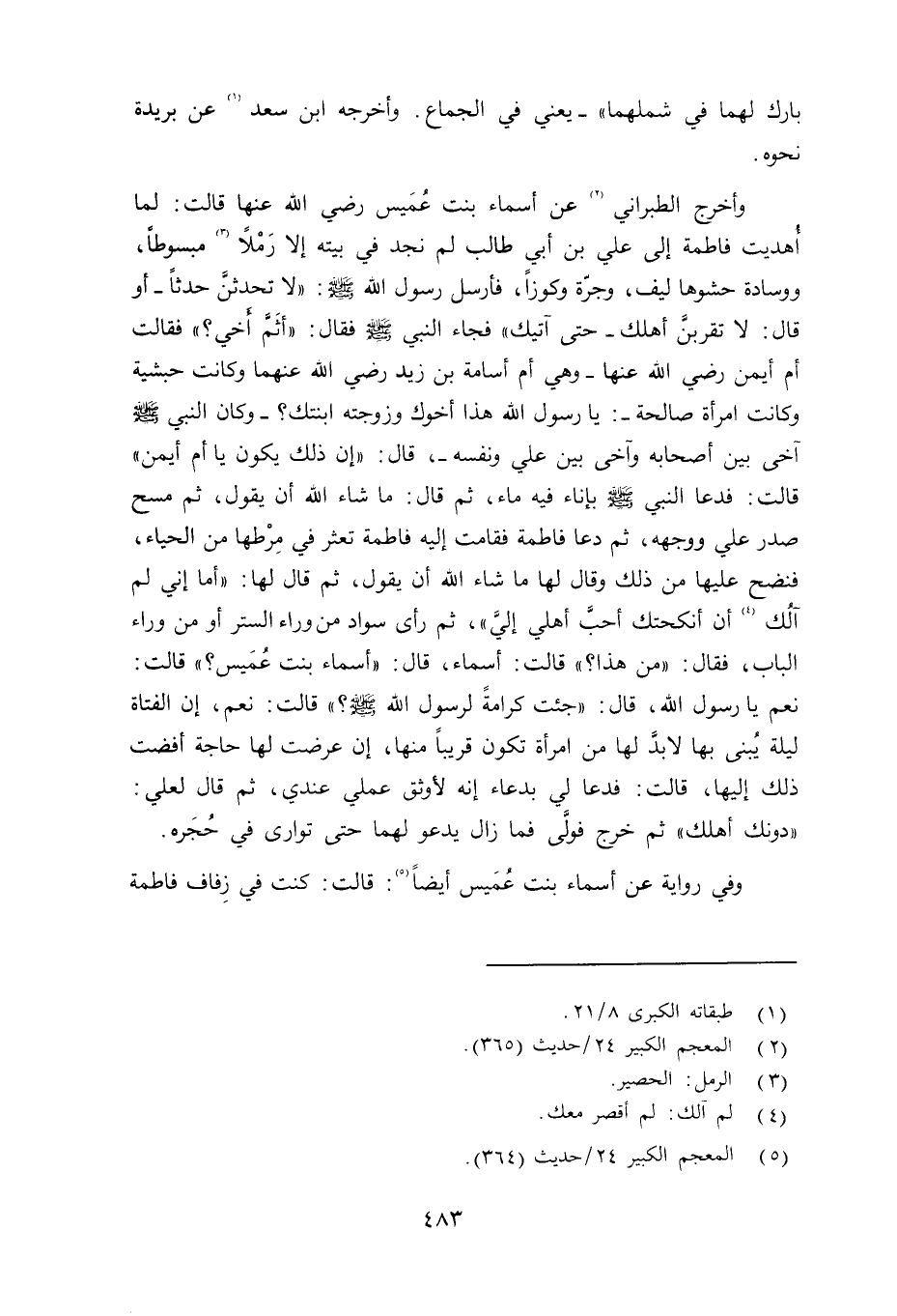 تابع وأخرج الطبراني عن أسماء بنت عُمَيس رضي الله عنها قالت: لما أُهديت فاطمة إلى علي بن أبي طالب لم نجد في بيته إلا رَمْلاً مبسوطاً، ووسادة حشوها ليف، وجرّة وكوزاً، فأرسل رسول الله صلى الله عليه وسلم «إلا تحدثنَّ حدثاً - أو قال: لا تقربنَّ أهلك - حتى آتيك» فجاء النبي صلى الله عليه وسلم فقال: «أثَمَّ أخي؟» فقالت أم أيمن رضي الله عنها - وهي أم أسامة بن زيد رضي الله عنهما وكانت حبشية وكانت امرأة صالحة -: يا رسول الله هذا أخوك وزوجته ابنتك؟ - وكان النبي صلى الله عليه وسلم آخى بين أصحابه وآخى بين علي ونفسه -، قال: «إن ذلك يكون يا أم أيمن» قالت: فدعا النبي صلى الله عليه وسلم بإناء فيه ماء، ثم قال: ما شاء الله أن يقول، ثم مسح صدر علي وجهه، ثم دعا فاطمة فاقمت إليه فاطمة تعثر في مِرْطها من الحياء، فنصح عليها من ذلك وقال لها ما شاء أن يقول، ثم قال لها؛ «أما إني لم آلُك أن أنكحتك أحبَّ أهلي إليَّ» ، ثم رأى سواداً من وراء الستر أو من وراء الباب، فقال: «من هذا؟» قالت: أسماء، قال: «أسماء بنت عُمَيس؟» قالت: نعم يا رسول الله، قال: «جئت كرامةً لرسول الله صلى الله عليه وسلم» قالت: نعم، إن الفتاة ليلة يُبنى بها لا بدَّ لها من امرأة تكون قريباً منها، إن عرضت لها حاجة أفضت ذلك إليها، قالت: فدعا لي بدعاء إنه لأوثق عملي عندي، ثم قال لعلي: «دونك أهلك» ثم خرج فولَّى فما زال يدعو لهما حتى تواى في حُجَره.