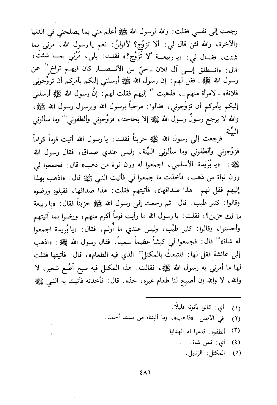 فرجعت إلى رسول الله صلى الله عليه وسلم حزيناً فقلت: يا رسول الله أتيت قوماً كراماً فزوّجوني وأطفوني وما سألوني البيِّنة، وليس عندي صداق، فقال رسول الله صلى الله عليه وسلم «يا بُريدة الأسلمي، اجمعوا لي فأتيت النبي صلى الله عليه وسلم قال: «اذهب بهذا إليهم فقل لهم: هذا صداقها» ، فأتيتهم فقلت: هذا صداقها، فقبلوه ورضوه وقالوا: كثير طيب. قال: ثم رجعت إلى رسول الله صلى الله عليه وسلم حزيناً فقال: «يا ربيعة ما لك حزين؟» فقلت: يا رسول الله ما رأيت قوماً أكرم منهم، ورضوا بما آتيتهم وأحسنوا، وقالوا: كثير طيِّب، وليس عندي ما أُولمُ، فقال: «يا بُريدة اجمعوا له شاة قال: فجمعوا لي كبشاً عظيماً سميناً، فقال رسول الله صلى الله عليه وسلم «ذاهب إلى عائشة فقل لها: فلتبعثْ بالمكتل الذي فيه الطعام» ، قال: فأتيتها فقلت لها ما أمرني به رسول الله صلى الله عليه وسلم فقالت: هذا المكتل فيه سبع آصُع شعير، لا والله لا والله إن أصبح لنا طعام غيره، خذه. قال: فأخذته فأتيت به النبي صلى الله عليه وسلم