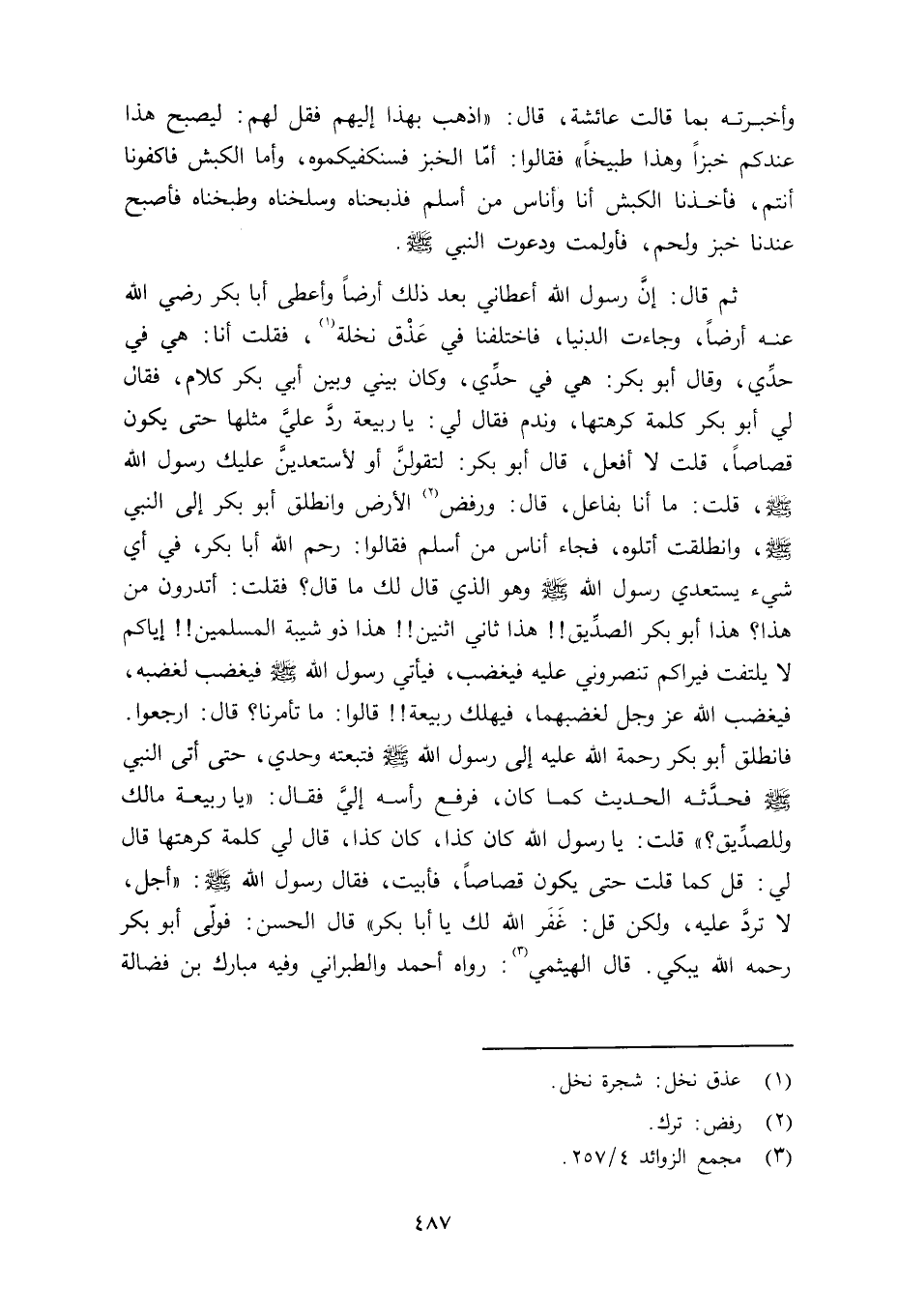 ثم قال: إنَّ رسول الله صلى الله عليه وسلم أعطاني بعد ذلك أرضاً وأعطى أبا بكر رضي الله عنه أرضاً، وجاءت الدنيا، فاختلفنا في عَذْق نخلة، فقلت أنا هي في حدِّي، وقال أبو بكر: هي في حدِّي، وكان بيني وبين أبي بكر كلام، فقال لي أبو بكر كلمة كرهتها، وندم فقال لي: يا ربيعة ردَّ عليَّ مثلها حتى يكون قصاصاً، قلت: لا أفعل، قال أبو بكر: لتقولنَّ أو لأستعدينَّ عليك رسول الله صلى الله عليه وسلم قلت: ما أنا بفاعل، قال: ورفض الأرض وانطلق أبو بكر إلى النبي صلى الله عليه وسلم وانطلقت أتلوه، فجاء أناس من أسلم فقالوا: رحم الله با بكر، في أي شيء يستعدي رسول الله صلى الله عليه وسلم وهو الذي قال لك ما قال؟ فقلت: أتدرون ما هذا؟ هذا أبو بكر الصِّديق هذا ثاني اثنين هذا ذو شيبة المسلمين إيَّاكم لا يلتفت فيراكم تنصروني عليه فيغضب، فيأتي رسول الله صلى الله عليه وسلم فيغضب لغضبه، فيغضب الله عز وجل لغضبهما، فيهلك ربيعة قال: ما تأمرنا؟ قال: ارجعوا. فانطلق أبو بكر رحمة الله عليه إلى رسول الله صلى الله عليه وسلم فتبعته وحدي، حتى أتى النبي صلى الله عليه وسلم فحدَّثه الحديث كما كان، فرفع رأسه إليَّ فقال: «يا ربيعة ما لك وللصدِّيق؟» قلت: يا رسول الله كان كذا، كان كذا، قال لي كلمة كرهتها قال لي: قل كما قلت حتى يكون قصاصاً، فأبيت، فقال رسول الله صلى الله عليه وسلم «أجل، لا تردَّ عليه، ولكن قل: غَفَر الله لك يا أبا بكر» قال الحسن: فولّى أبو بكر رحمه الله يبكي. قال الهيثمي: رواه أحمد والطبراني وفيه مبارك بن فضالة