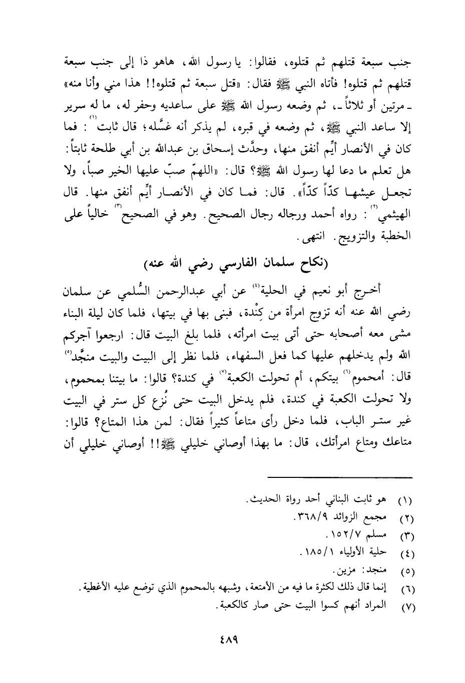 أخرج أبو نعيم في الحلية عن أبي عبد الرحمن السُّلمي عن سلمان رضي الله عنه أنه تزوج امرأة من كِنْدة، فبنى بها في بيتها، فلما كان ليلة البناء مشى معه أصحابه حتى أتى بيت امرأته، فلما بلغ البيت قال: ارجعوا آجركم الله ولم يدخلهم عليها كما فعل السفهاء، فلما نظر إلى البيت والبيت منجَّد قال: أمحموم بيتكم، أم تحولت الكعبة في كندة؟ قالوا: ما بيتنا بمحموم، ولا تحولت الكعبة في كندة، فلم يدخل البيت حتى نُزع كل ستر البيت غير ستر الباب، فلما دخل رأى متاعاً كثيراً فقال: لمن هذا المتاع؟ قالوا: متاعك ومتاع امرأتك، قال: ما بهذا أوصاني خليلي صلى الله عليه وسلم أوصاني خليلي أن