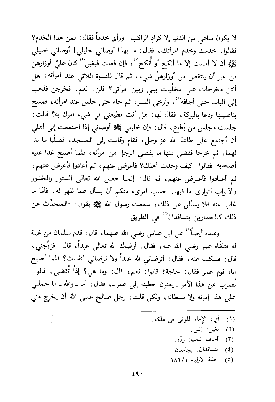 لا يكون متاعي من الدنيا إلا كزادِ الراكب. ورأى خدماً فقال: لمن هذا الخدم؟ فقالوا: خدمك وخدم امرأتك، فقال: ما بهذا أوصاني خليلي صلى الله عليه وسلم أن لا أمسك إلا ما أنكح أو أُنكْح، فإن فعلت فبغين كان عليَّ أوزارهن من غير أن ينتقص من أوزارهنَّ شيء، ثم قال للنسوة اللاتي عند امرأته: هل أنتن مخرجات عني مخلِّيات بيني وبين امرأتي؟ قلن: نعم، فخرجن فذهب إلى الباب حتى أجافه، وأرخى الستر، ثم جاء حتى جلس عند امرأته فمسح بناصيتها ودعا بالبركة، فقال لها: هل أنت مطيعتي في شيء آمرك به؟ قالت: جلست مجلس من يُطاع، قال: فإن خليلي صلى الله عليه وسلم أوصاني إذا اجتمعت إلى أهلي أن أجتمع على طاعة الله عز وجل، فقام وقامت إلى المسجد، فصلَّيا ما بدا لهما، ثم خرجا فقضى منها ما يقضي الرجل من امرأته، فلما أصبح غدا عليه أصحابه فقالوا: كيف وجدت أهلك؟ فأعرض عنهم، ثم أعادوا فأعرض عنهم، ثم أعادوا فأعرض عنهم، ثم قال: إنما جعل الله تعالى الستور والخدور والأبواب لتواري ما فيها. حسب امرىء منكم أن يسأل عما ظهر له، فأمَّا ما غاب