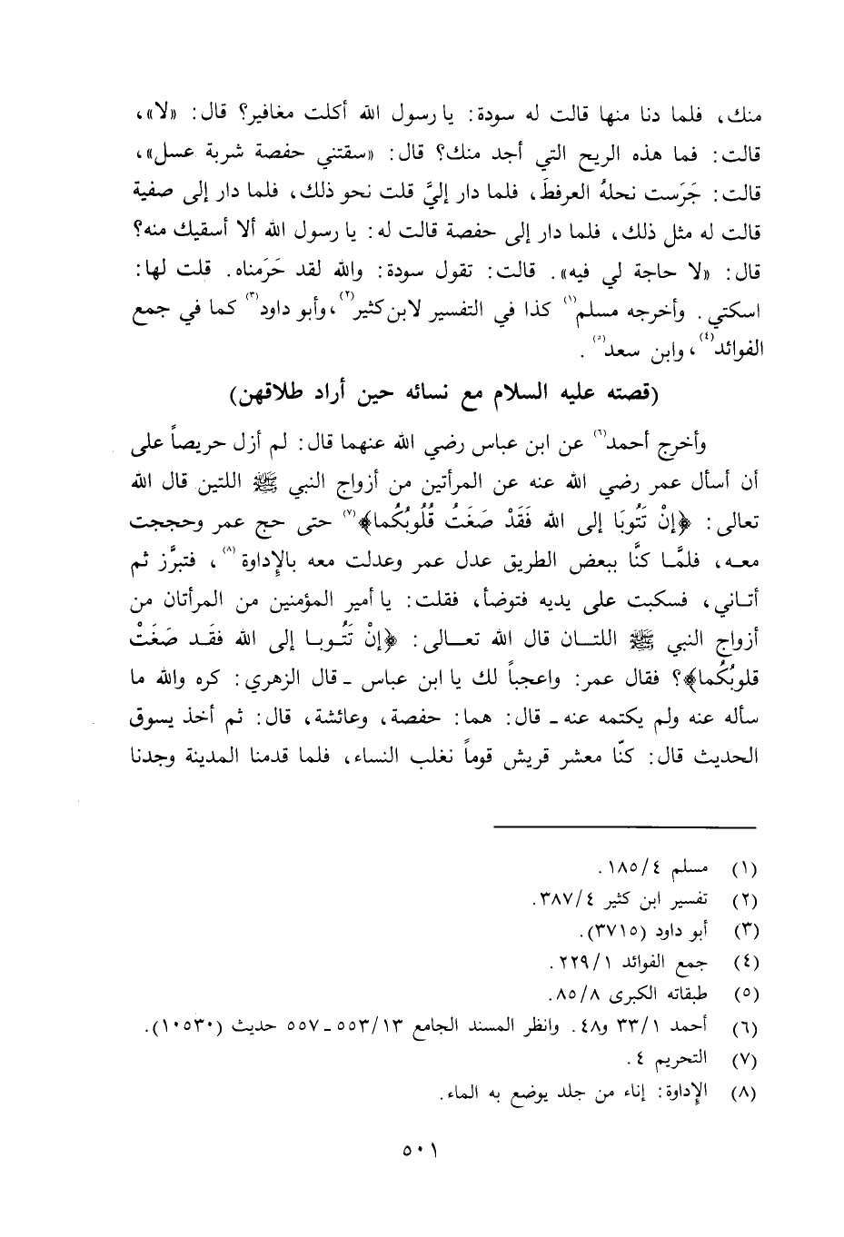 منك، فلما دنا منها قالت له سودة: يا رسول الله أكلت مغافير؟ قال: «لا» ، قالت: فما هذه الريح التي أجد منك؟ قال: «سقتني حفصة شربة عسل» ، قالت: جَرَست نحلةُ العرفطَ، فلما دار إليَّ قلت نحو ذلك، فلما دار إلى صفية قالت له مثل ذلك، فلما دار إلى حفصة قالت له: يا رسول الله ألا أسقيك منه؟ قال: «لا حاجة لي فيه» . قالت: تقول سودة: والله لقد حَرَمناه. قلت لها: اسكتي. وأرخجه مسلم كذا في التفسير لابن كثير وأبو داود كما في جمع الفوائد وابن سعد.