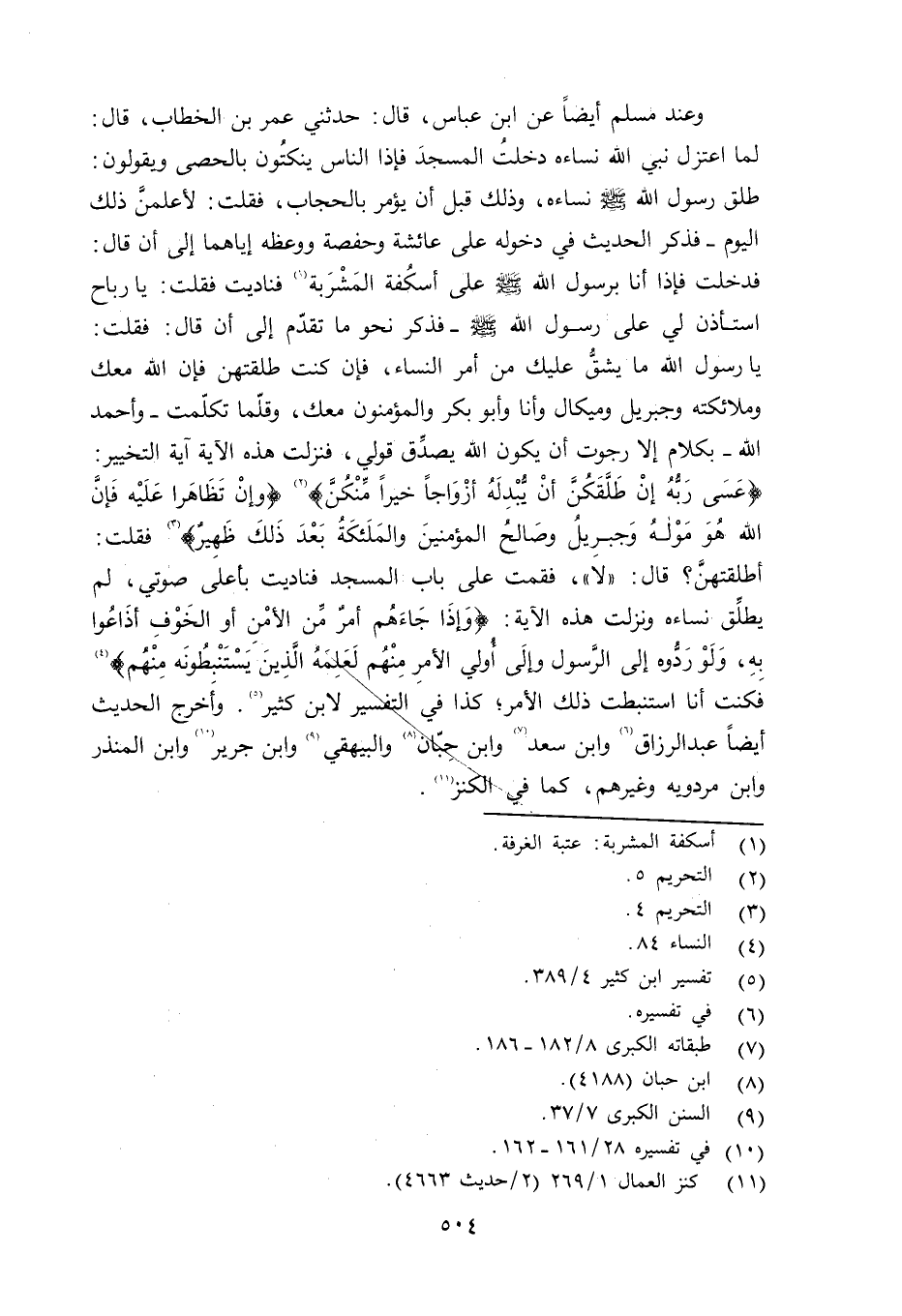 وعند مسلم أيضاً عن ابن عباس قال: حدثني عمر بن الخطاب قال: لما اعتزل نبي الله صلى الله عليه وسلم نساءه دخلت المسجد فإذا الناس ينكتُون بالحصى ويقولون: طلَّق رسول الله نساءه، وذلك قبل أن يؤمر بالحجاب، فقلت: لأعلمنَّ ذلك اليوم - فذكر الحديث في دخوله على عائشة وحفصة ووعظه إياهما إلى أن قال: فدخلت فإذا أنا برسول الله صلى الله عليه وسلم على أسكفة المشربة فناديت فقلت: يا رباح استأذن لي على رسول الله صلى الله عليه وسلم ـ فذكر نحو ما يتقدَّم إلى أن قال: فقلت: يا رسول الله ما يشقُّ عليك من أمر النساء، فإن كنت طلقتهن فإن الله معك وملائكته وجبريل وميكال وأنا وأبو بكر والمؤمنون مع، وقلّما تكلّمت - وأحمد الله - بكلام إلا رجوت أن يكون الله يصدِّق قولي، فنزلت هذه الآية آية التخيير: {عَسَى رَبُّهُ إِن طَلَّقَكُنَّ أَن يُبْدِلَهُ أَزْواجاً خَيْراً مّنكُنَّ} (سورة التحريم، الآية: 5) - {وإن تظاهرا عليه فإن اهو موله وجبريل وصالح المؤمنين والملائكة بعد ذلك ظهير} (سورة التحريم، الآية: 4) فقلت: أطلقتهنَّ؟ قال: «لا» ، فقمت على باب المسجد فناديت بأعلى صوتي: لم يطلِّق نساءه ونزلن هذه الآية: {وإذا جاءهم أمر من الامن أو الخوف أذاعوا بهولو روده إلى الرسول وإلى أولي الأمر منهم لعلمه الذين يستنبطونه منهم} (سورة التحريم، الآية: 5) فكنت أنا استنبطت ذلك الأمر؛ كذا في التفسير لابن كثير. وأخرج الحديث أيضاً عبد الرزاق وابن سعد وابن حِبّان والبيهقي وابن جرير وابن المنذر وابن مردويه وغيرهم، كما في الكنز.